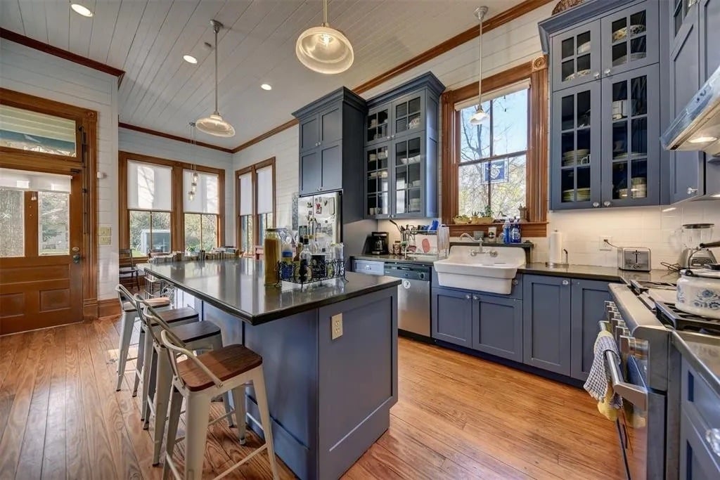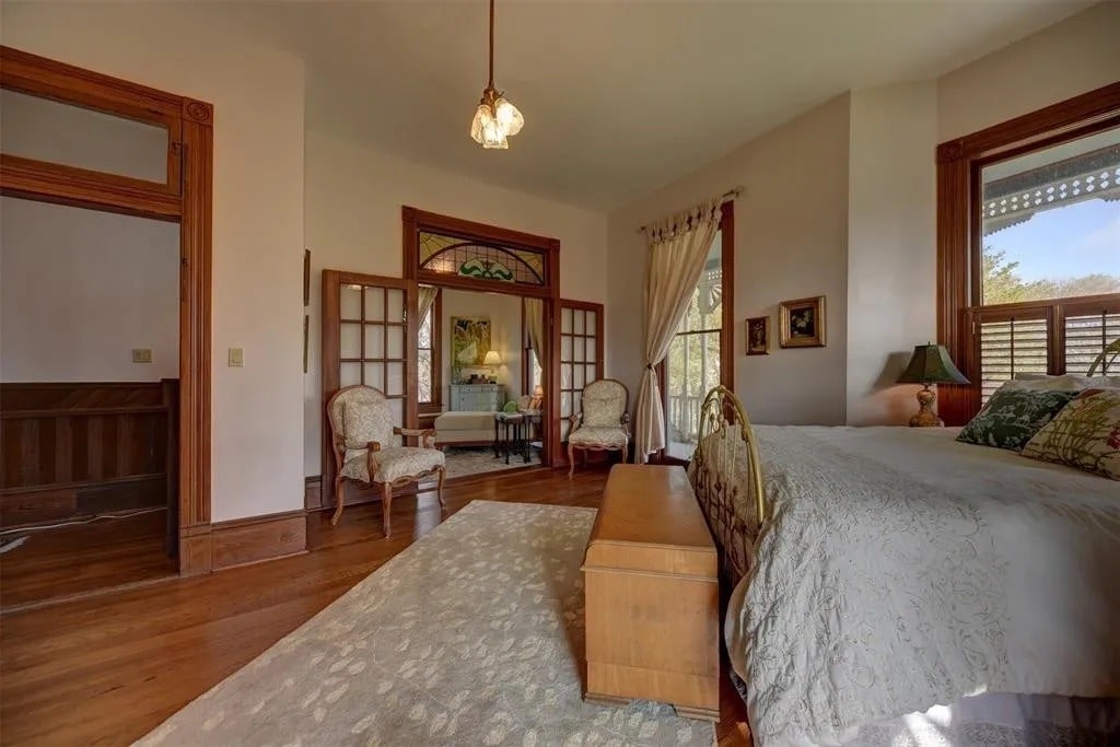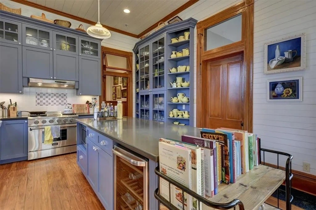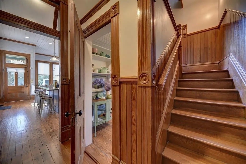 Although the house has been enhanced, it still has original features, such as hardwood floors, wainscoting, lofty ceilings, and wood-burning fireplaces, which imbue the home with timeless allure.