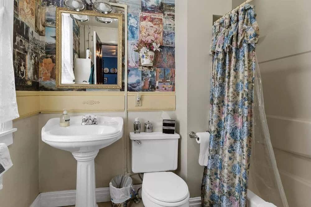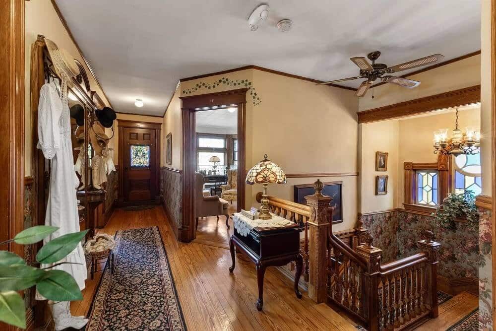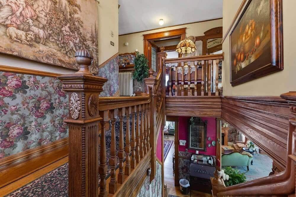 The house boasts a 3,872 sq ft interior area with 6 bedrooms and 8.5 bathrooms and was designed in Queen Anne confection architecture.
