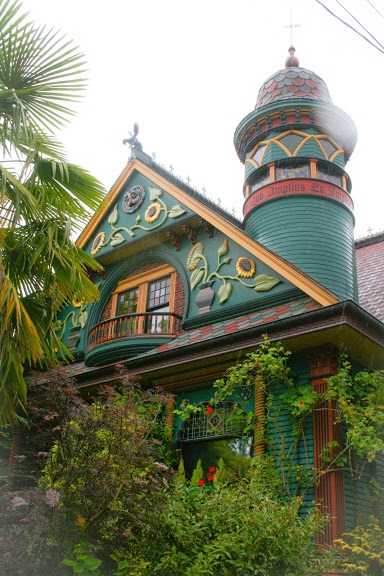 The house features a turret, sunflower carvings, and cast-iron griffins, all painted in deep greens, gold, and burgundy.
