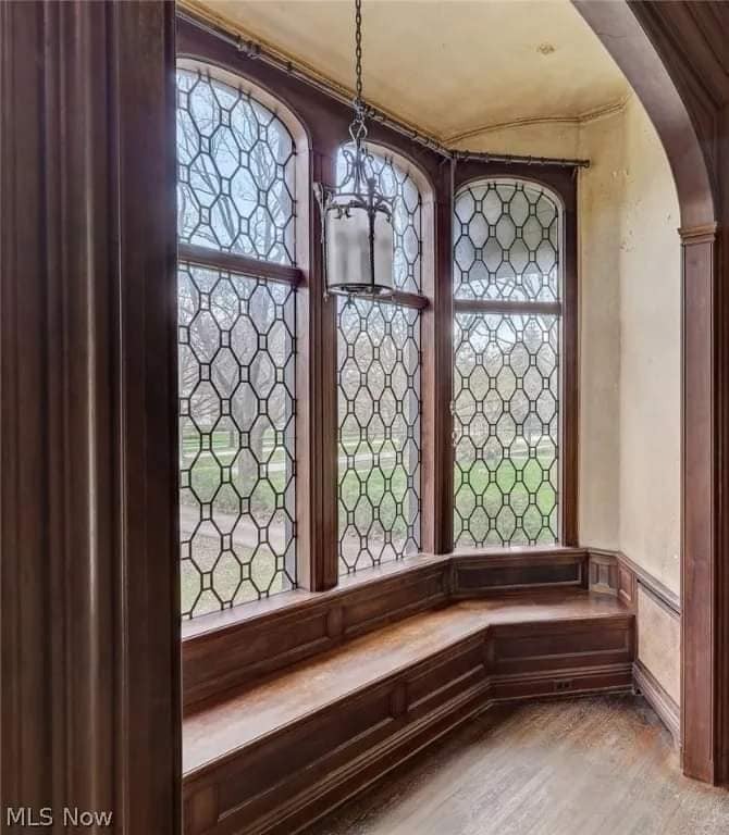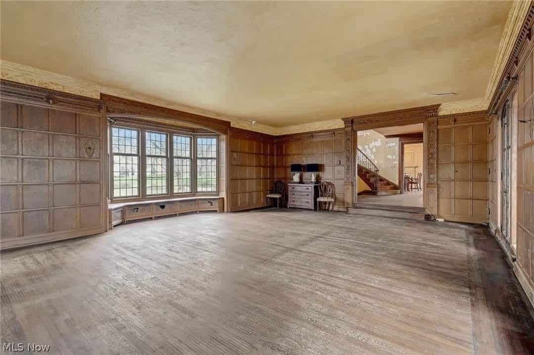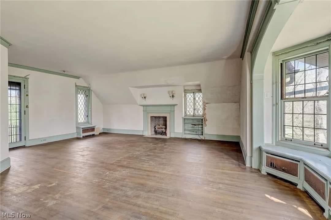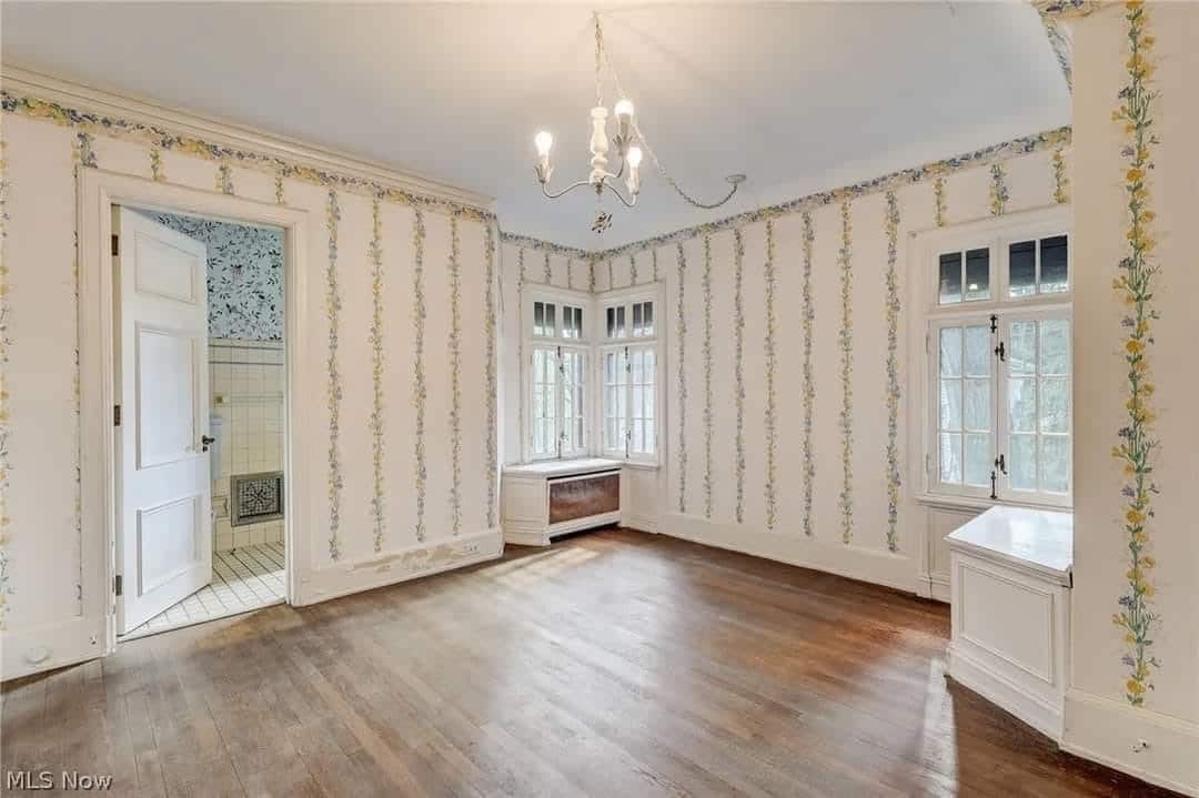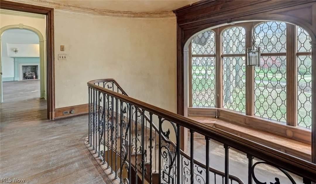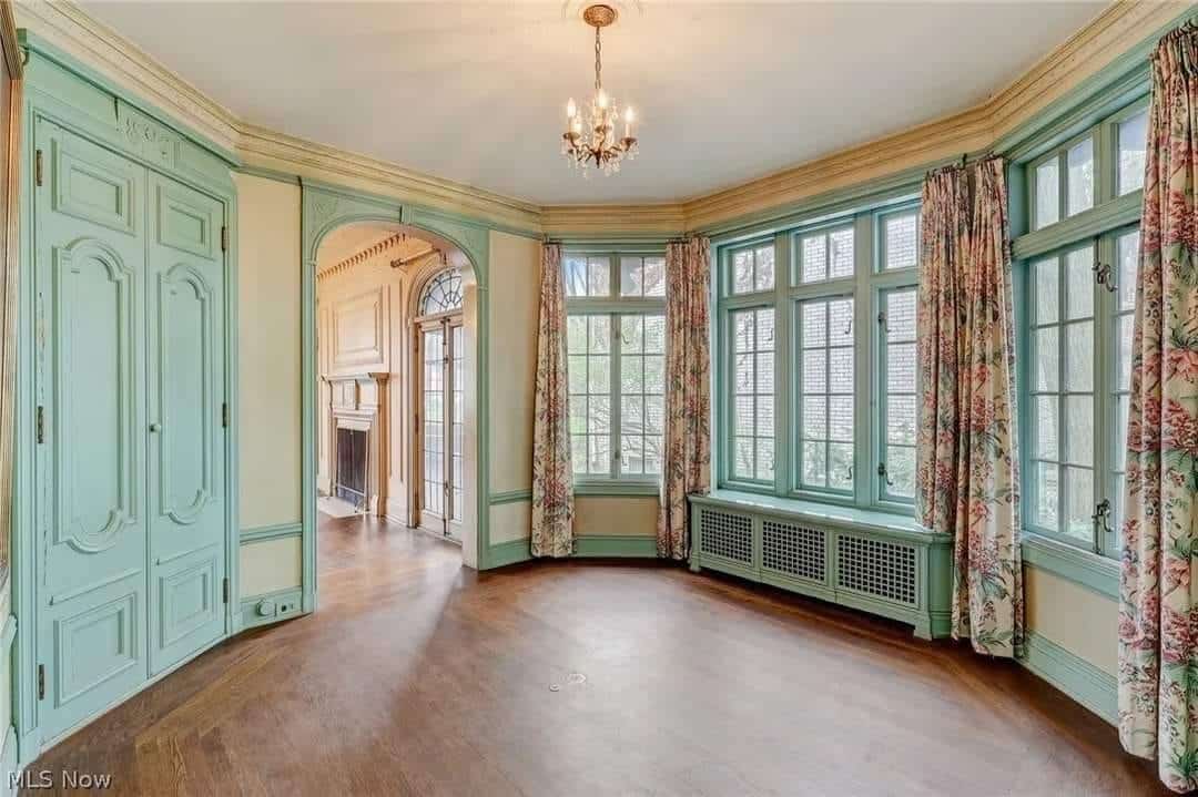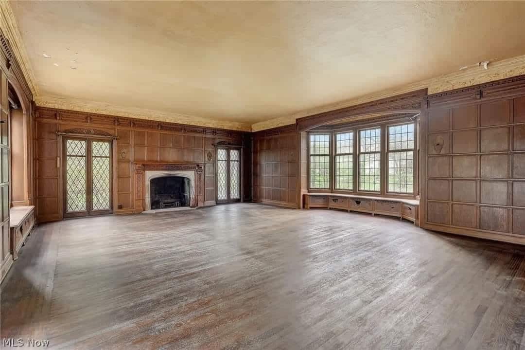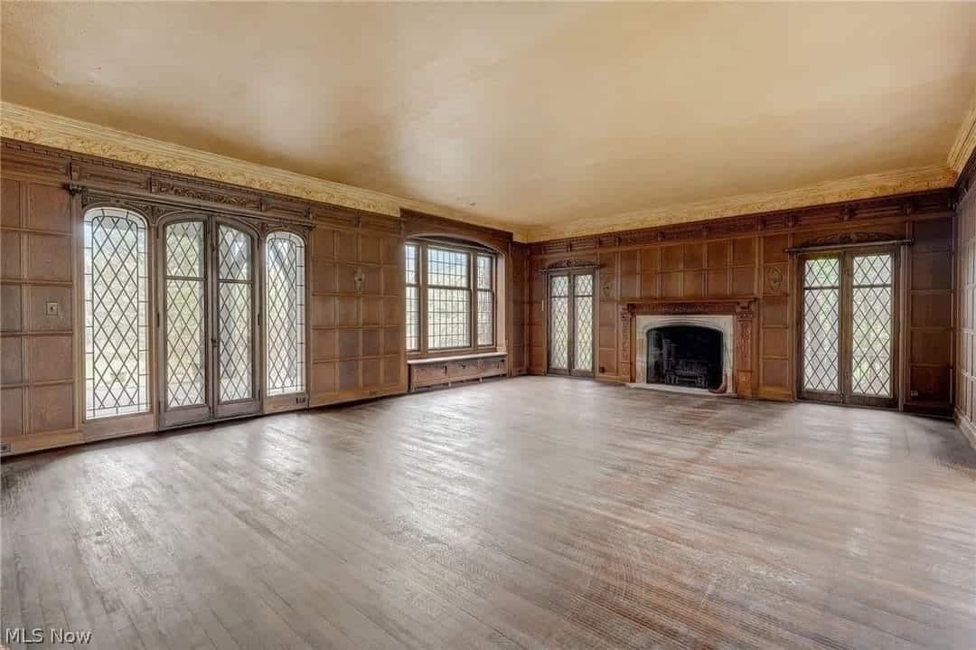 The home features beautiful, detailed millwork, four fireplaces, hardwood floors, and tall leaded glass windows and doors.