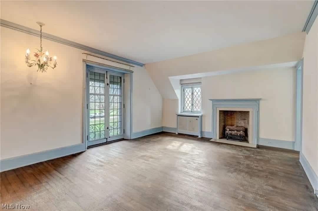 The living room is adorned with wood flooring and a fireplace, providing a cozy and inviting atmosphere.