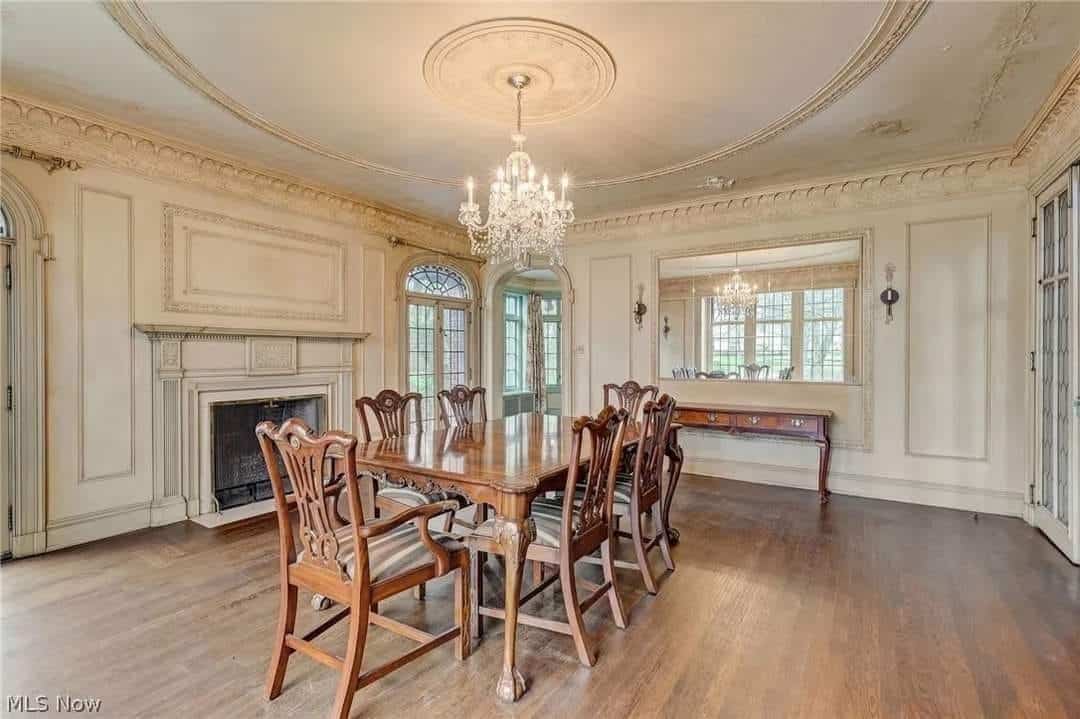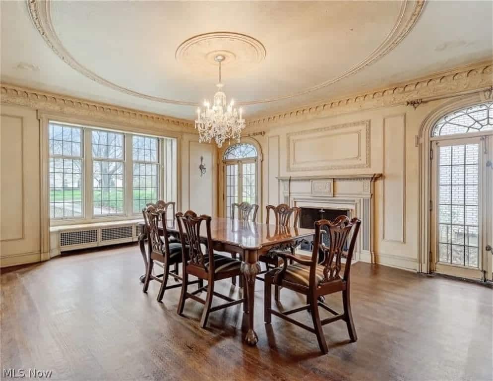 The dining room also showcases the same wood flooring and a fireplace, enhancing the home’s warm and welcoming feel.