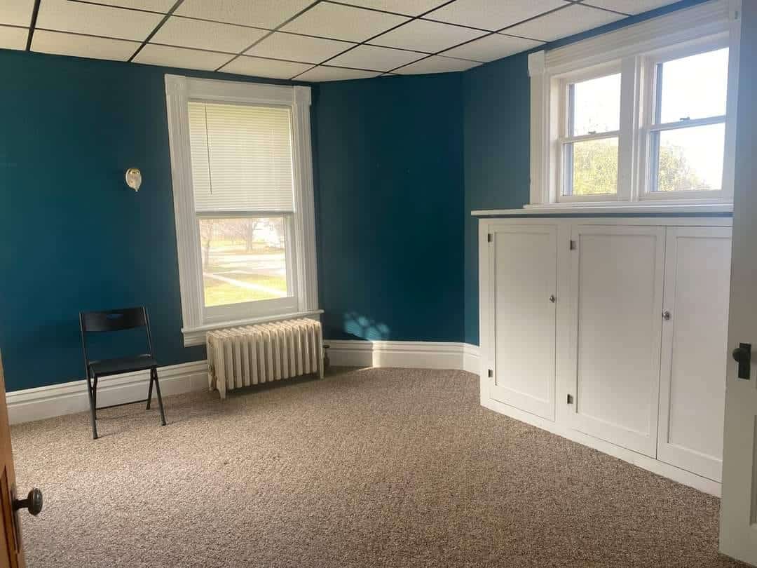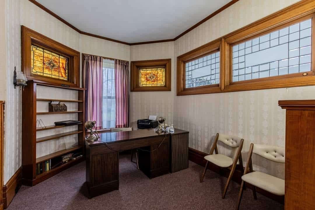 The office room features prism and stained glass windows, plus three fabulous bookcases.