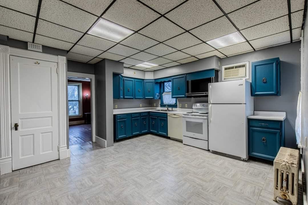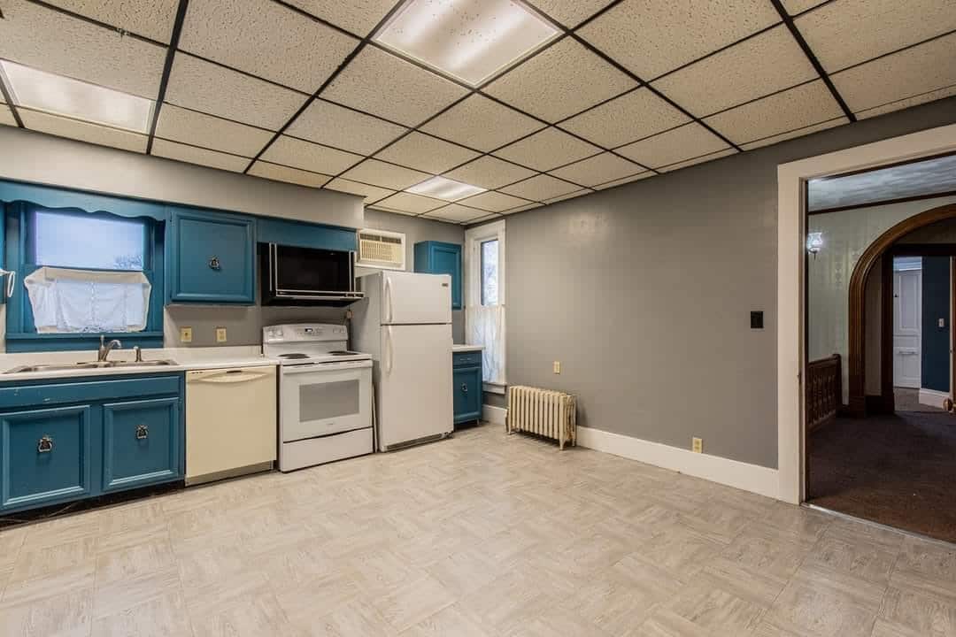 The main floor kitchen has been removed, but there is a functional kitchen upstairs to use until you reinstall the main floor one, if desired.
