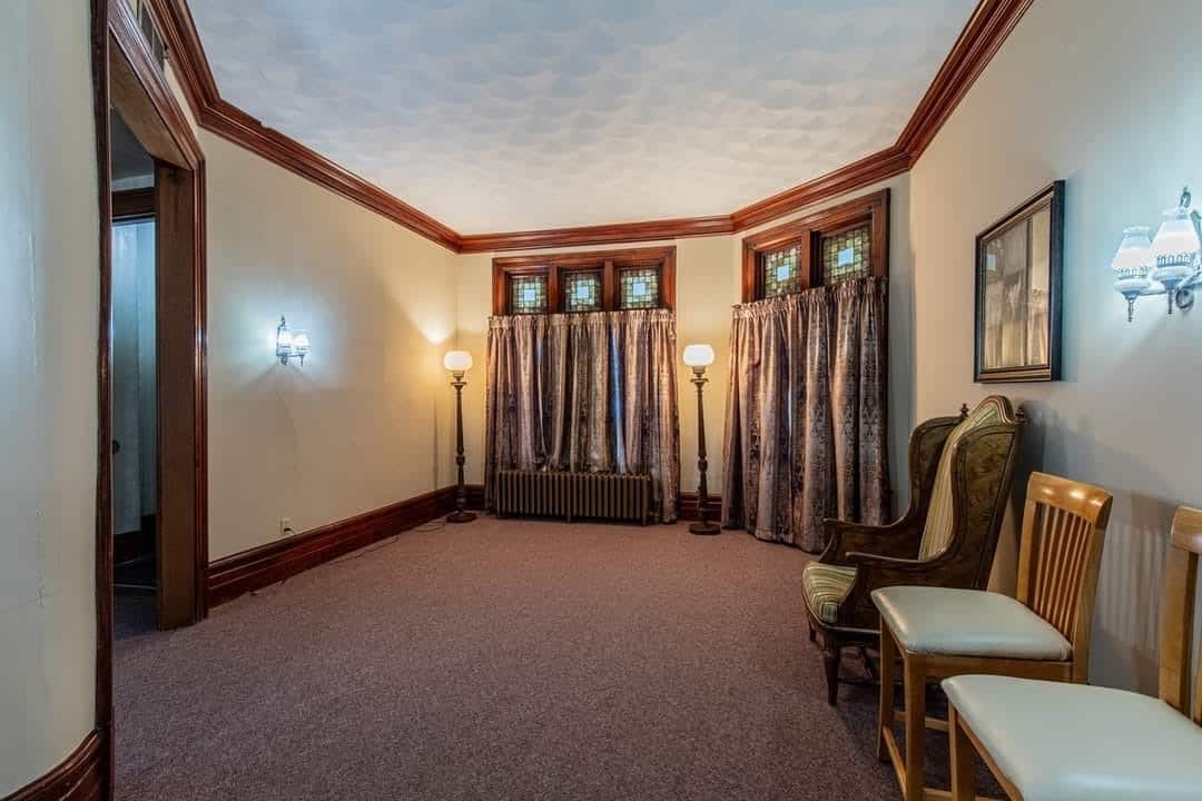 It is adorned with fantastic windows of stained glass and prism glass, surrounded by vast, old millwork from days gone by.