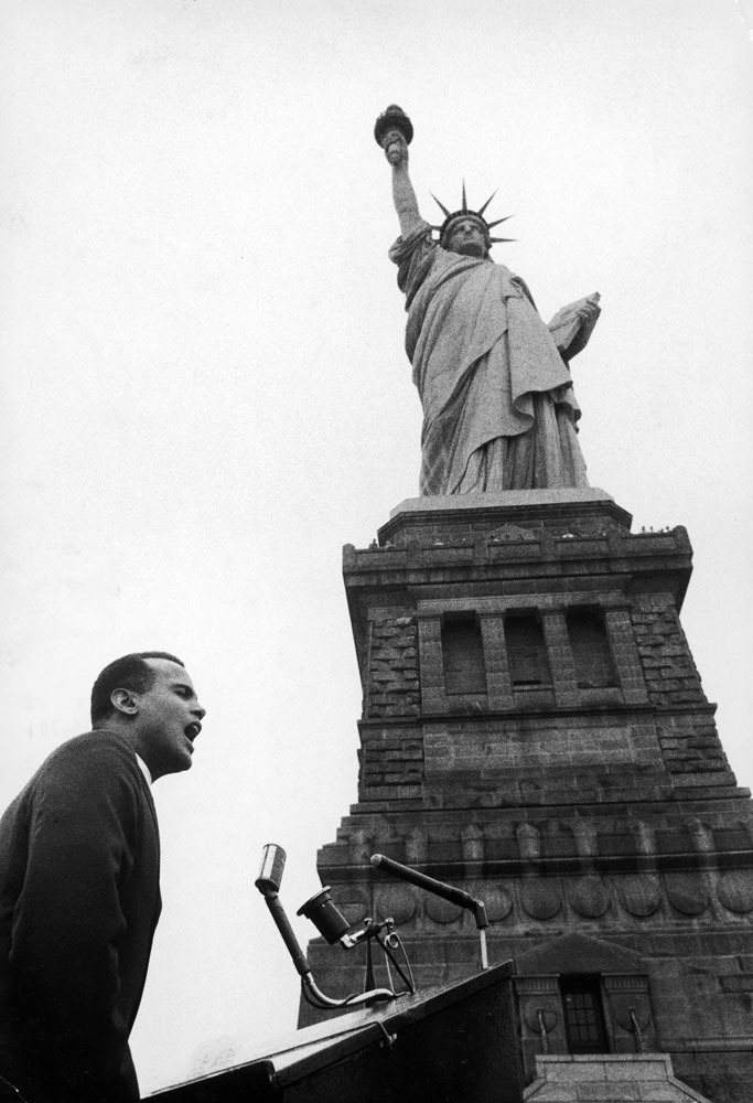 Harry Belafonte speaks at a civil rights rally at the Statue of Liberty, 1960