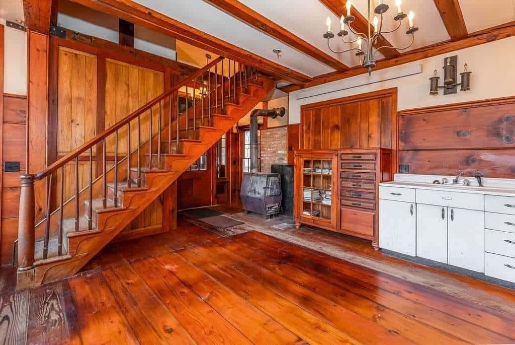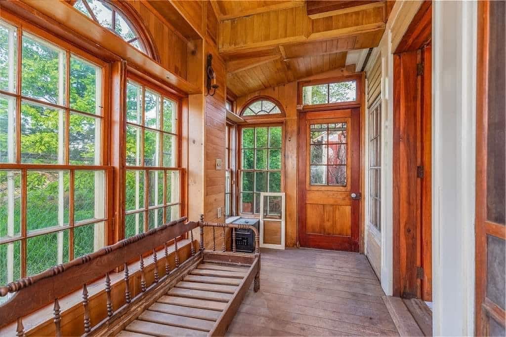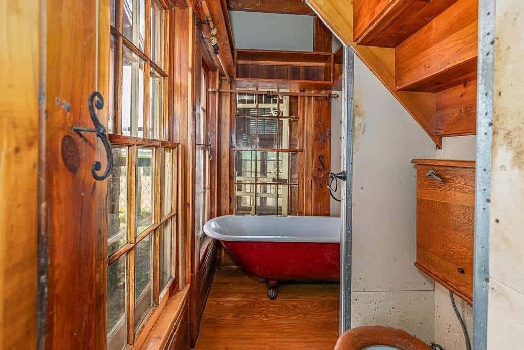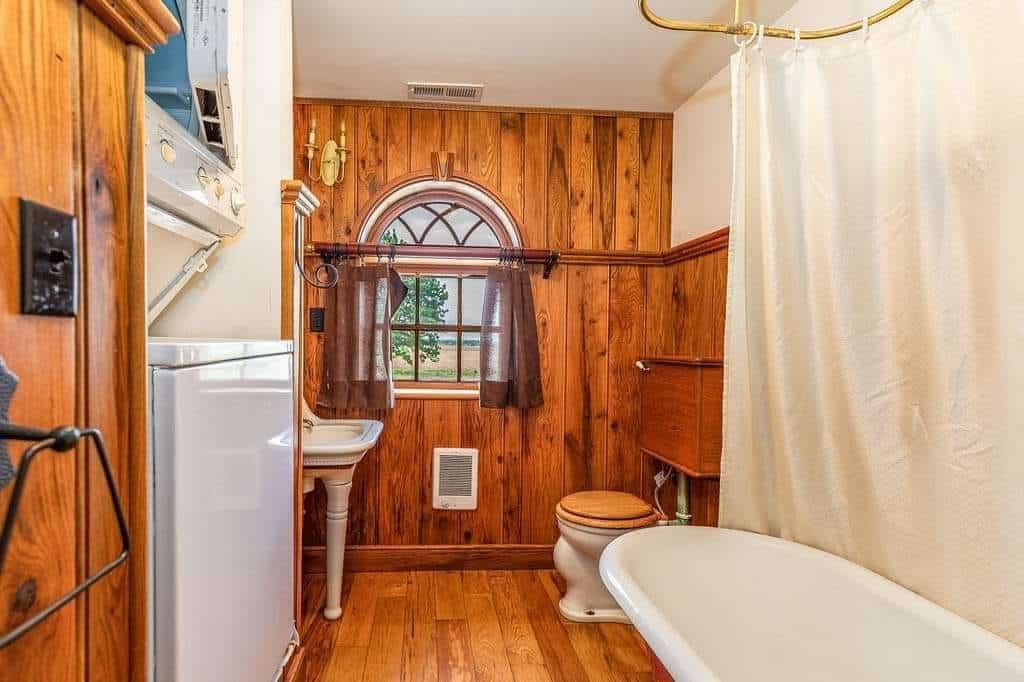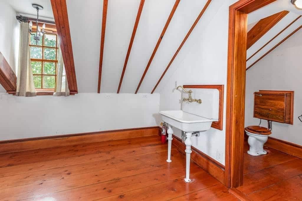 The interior boasts remarkable craftsmanship, including bath fixtures with original manufacturer stamps and many intricately crafted wooden toilet tanks, showcasing the skills of a former owner who was a talented millwright.