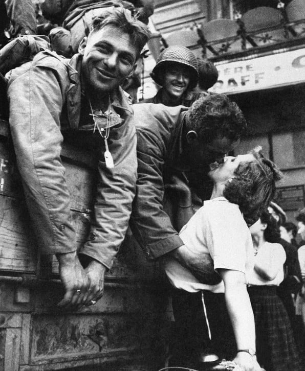 This image was shot during the liberation of Paris on August 25th, 1944. In the photo, an American soldier is depicted leaning over the side of an army vehicle to kiss a French woman who is riding a bicycle.