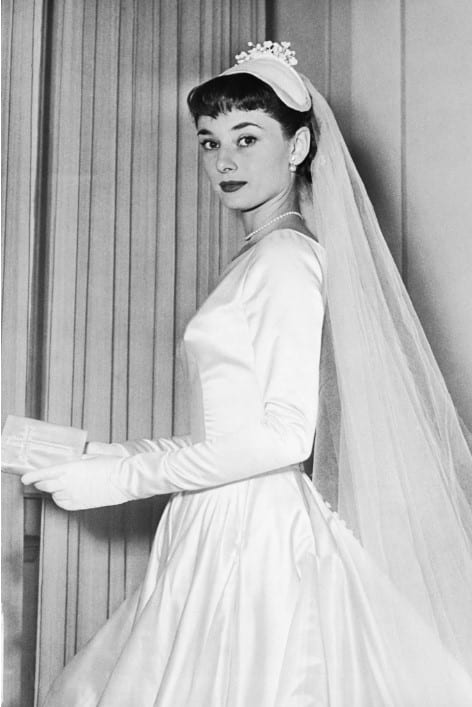 Hepburn’s first wedding dress was elegant and simple, reflecting her unique fashion sense. It featured a demure boatneck, long sleeves, and a playful high-low hemline.