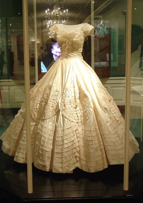 Jacqueline Bouvier’s wedding dress, worn when she married John F. Kennedy in 1953, remains iconic in bridal fashion history.