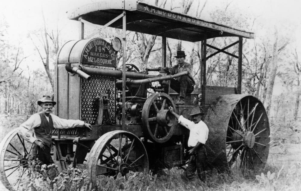Melbourne manufactured tractor on a farm in the Rockhampton district, 1914