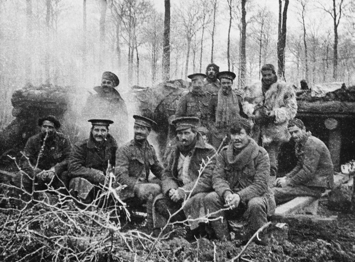 Group of Britain’s 1st Battalion London Rifle Brigade just after dinner, at Ploegsteert Wood, Belgium, on Christmas 1914.