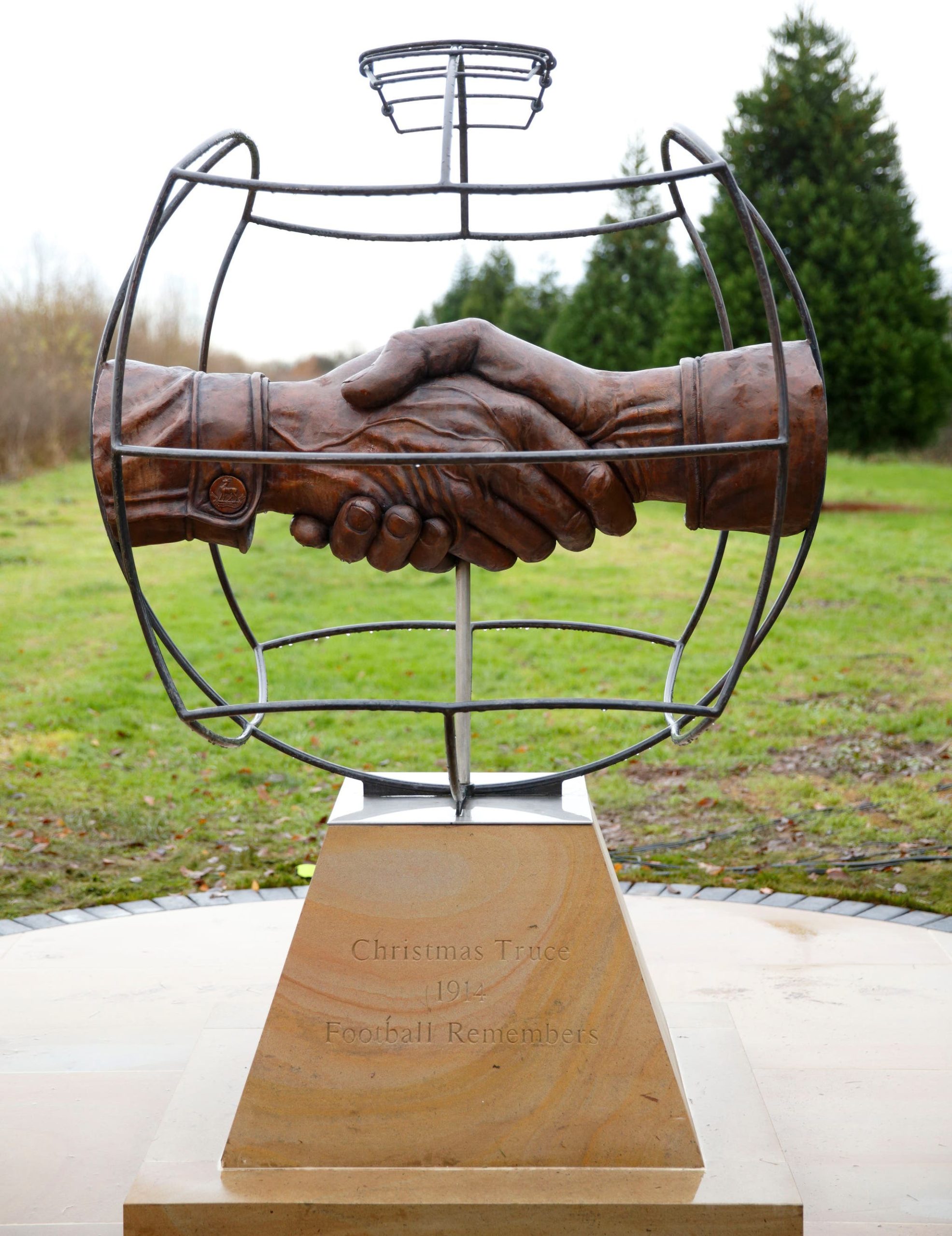 In Saint-Yvon, Belgium, a steel soccer ball atop an exploded shell was presented to honor the Christmas games.