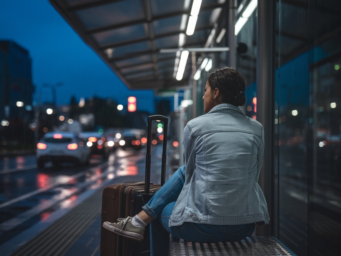 One evening, it was pouring rain. As I drove past the bus stop, I saw her sitting there again. Her suitcase was tucked close beside her, and she was wearing a thin, faded light-blue jacket with worn-out sneakers.