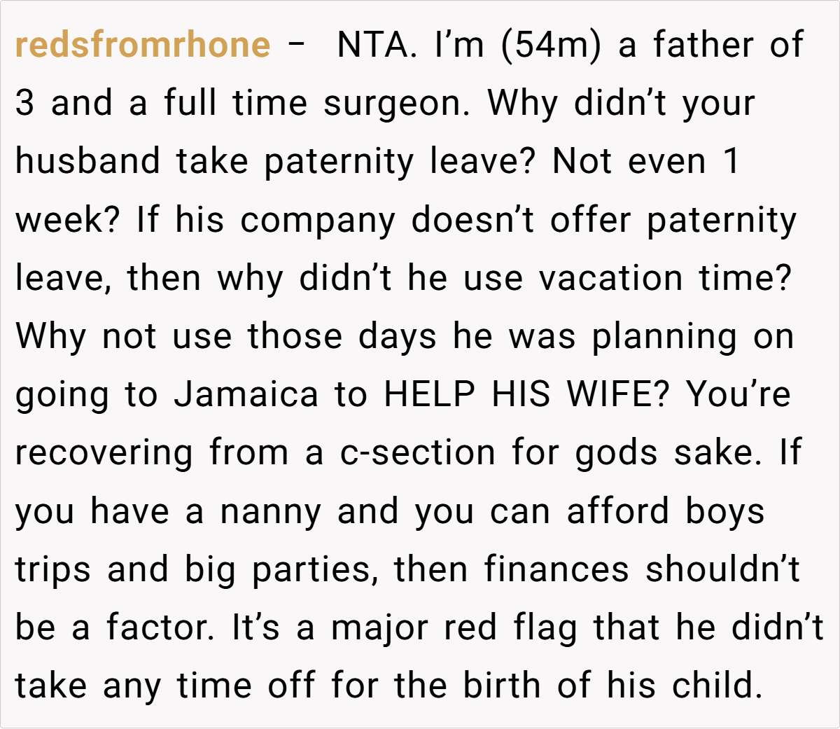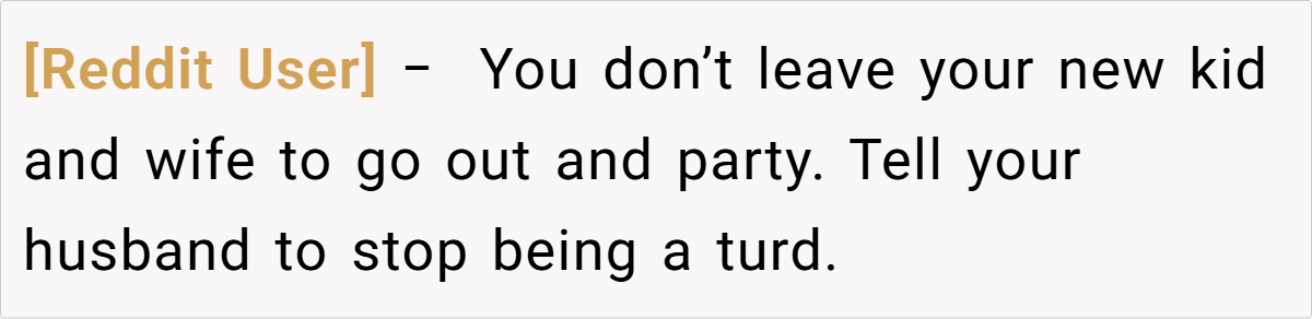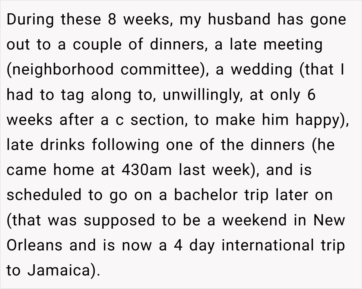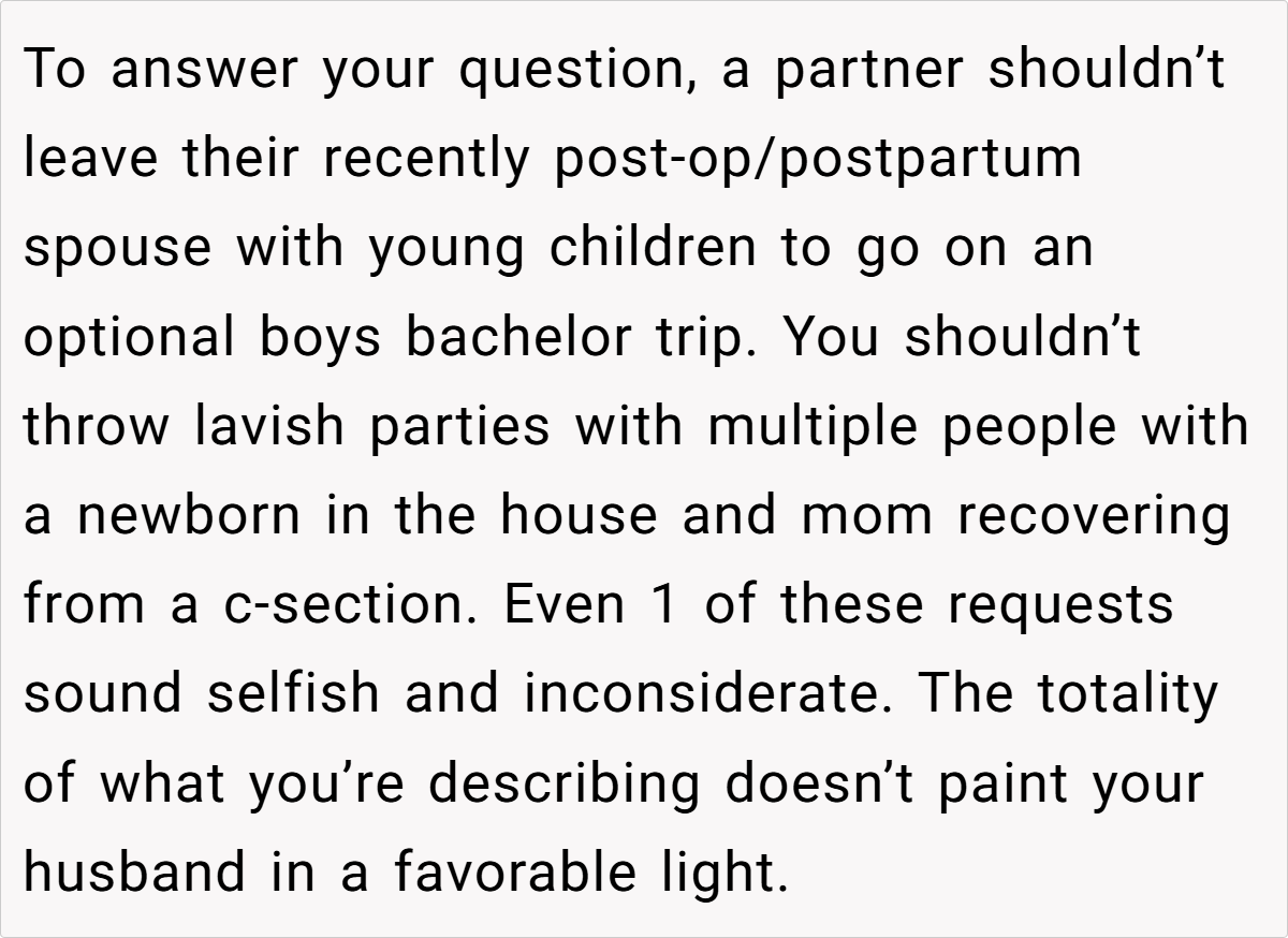 Meanwhile, her husband, who works from home and earns much less than she does, has been indulging in multiple social outings—even scheduling an extended bachelor trip. Now, his plan to attend a double birthday party in NYC this Friday has sparked a heated debate over what it means to be a supportive partner during the crucial postpartum period. Is it reasonable to expect him to cut back on late nights for the sake of family recovery?