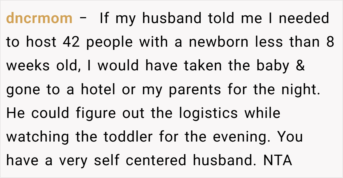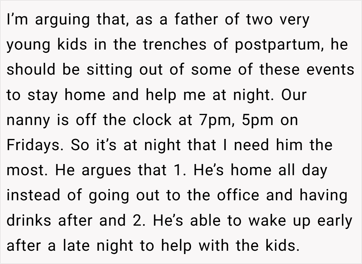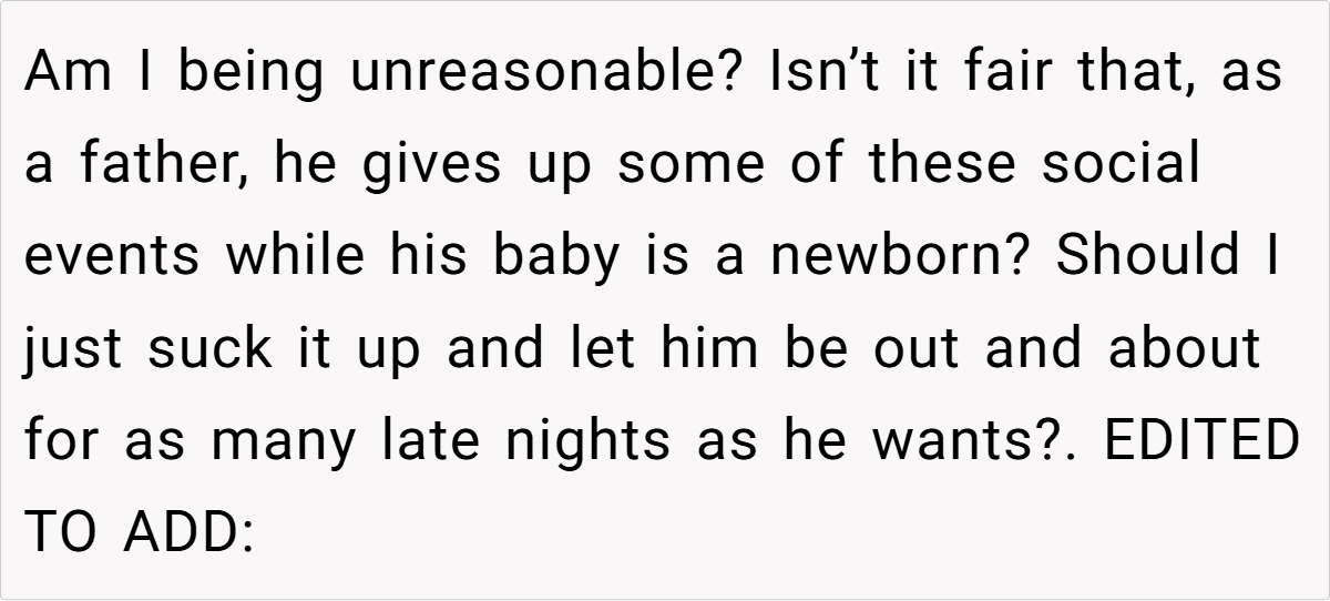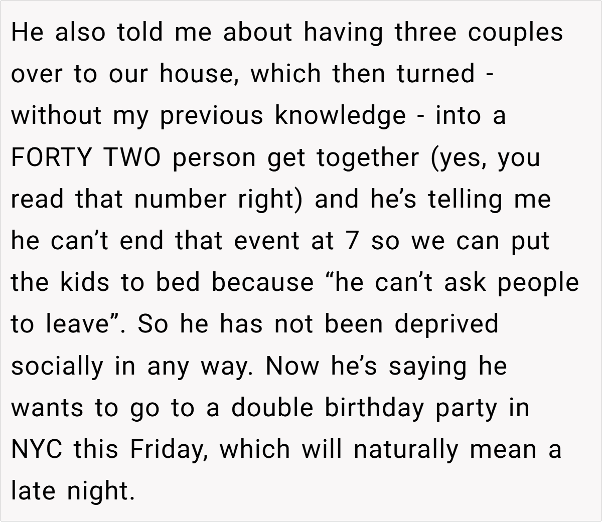 Meanwhile, her husband, who works from home and earns much less than she does, has been indulging in multiple social outings—even scheduling an extended bachelor trip. Now, his plan to attend a double birthday party in NYC this Friday has sparked a heated debate over what it means to be a supportive partner during the crucial postpartum period. Is it reasonable to expect him to cut back on late nights for the sake of family recovery?