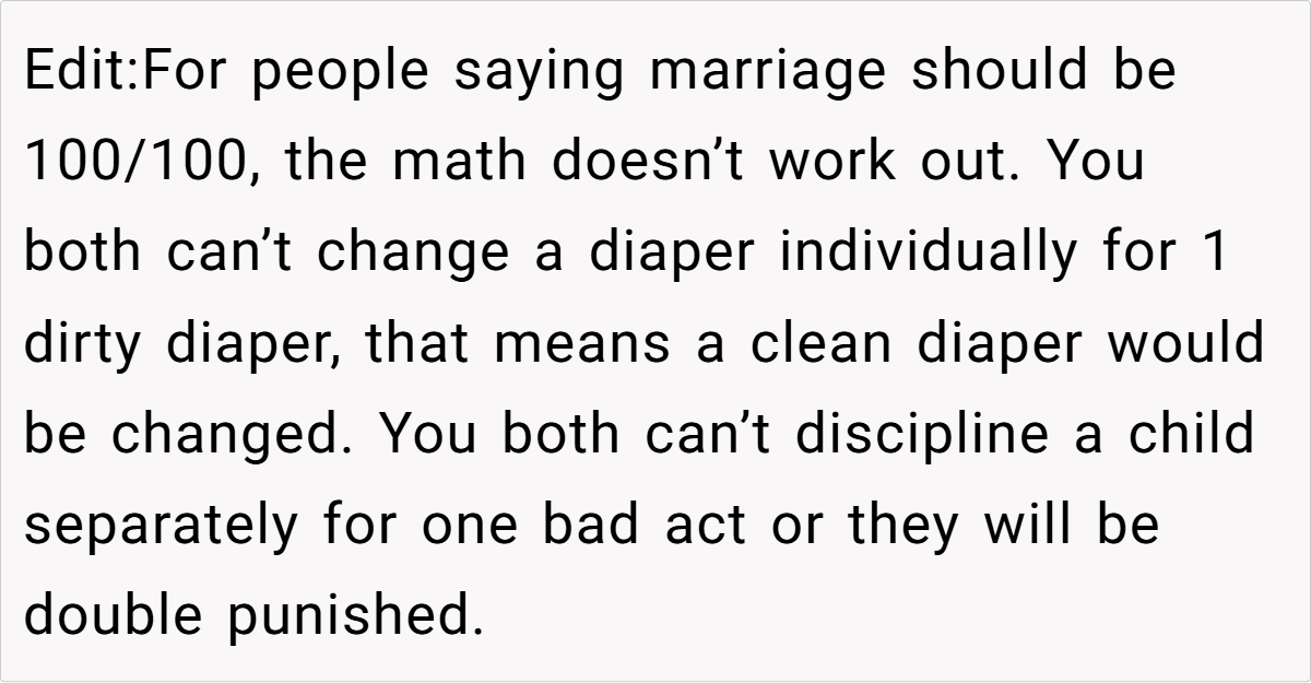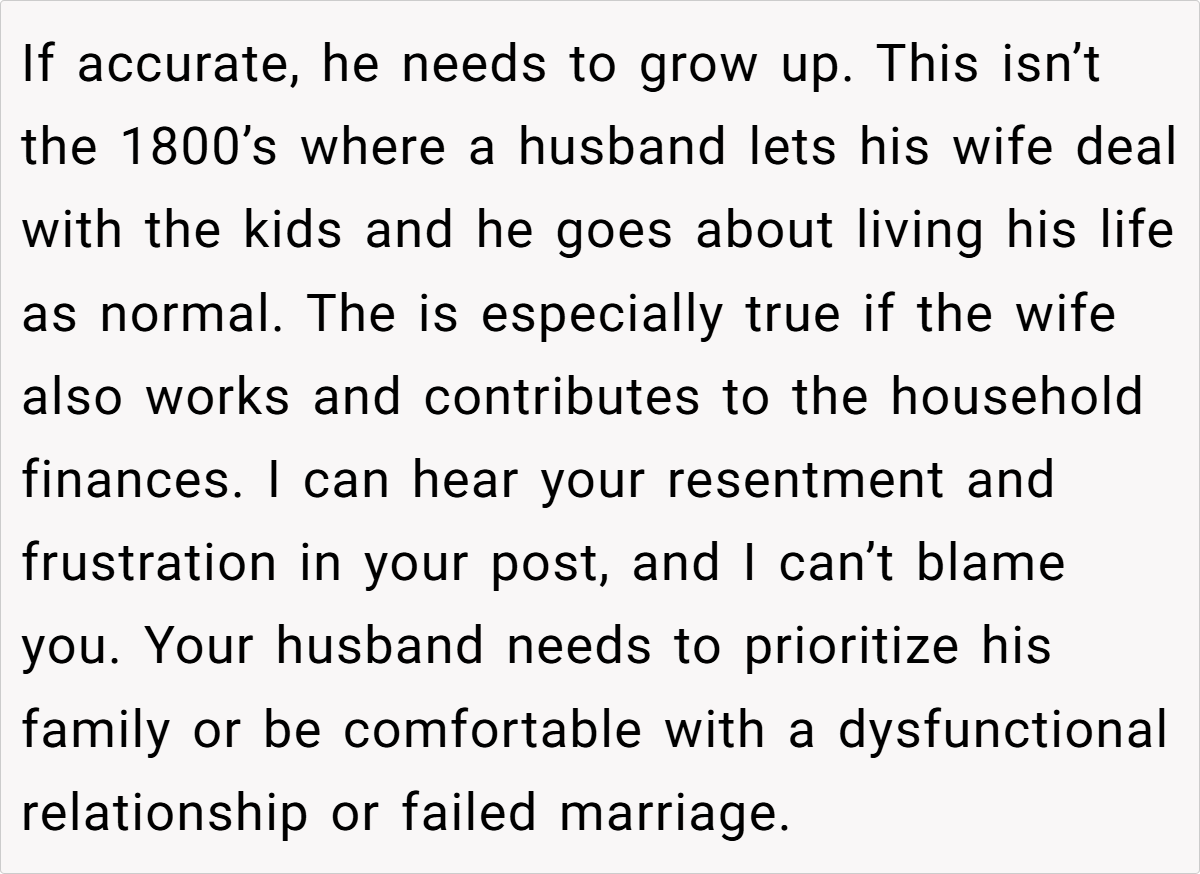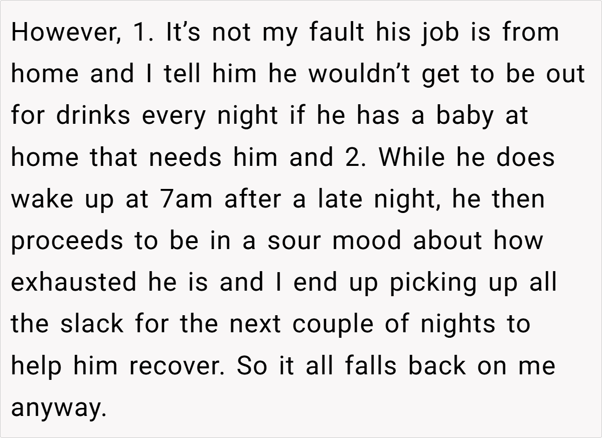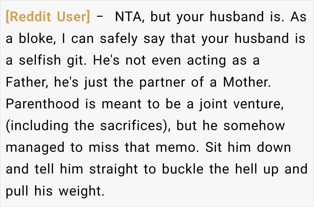 She further points out that even if the father believes he’s compensating by being home during the day, the real challenge is the nighttime when support is most needed. “It’s about quality of support, not just quantity of hours at home,” she notes. “When late nights leave your partner exhausted and irritable, the entire family feels the ripple effects.”