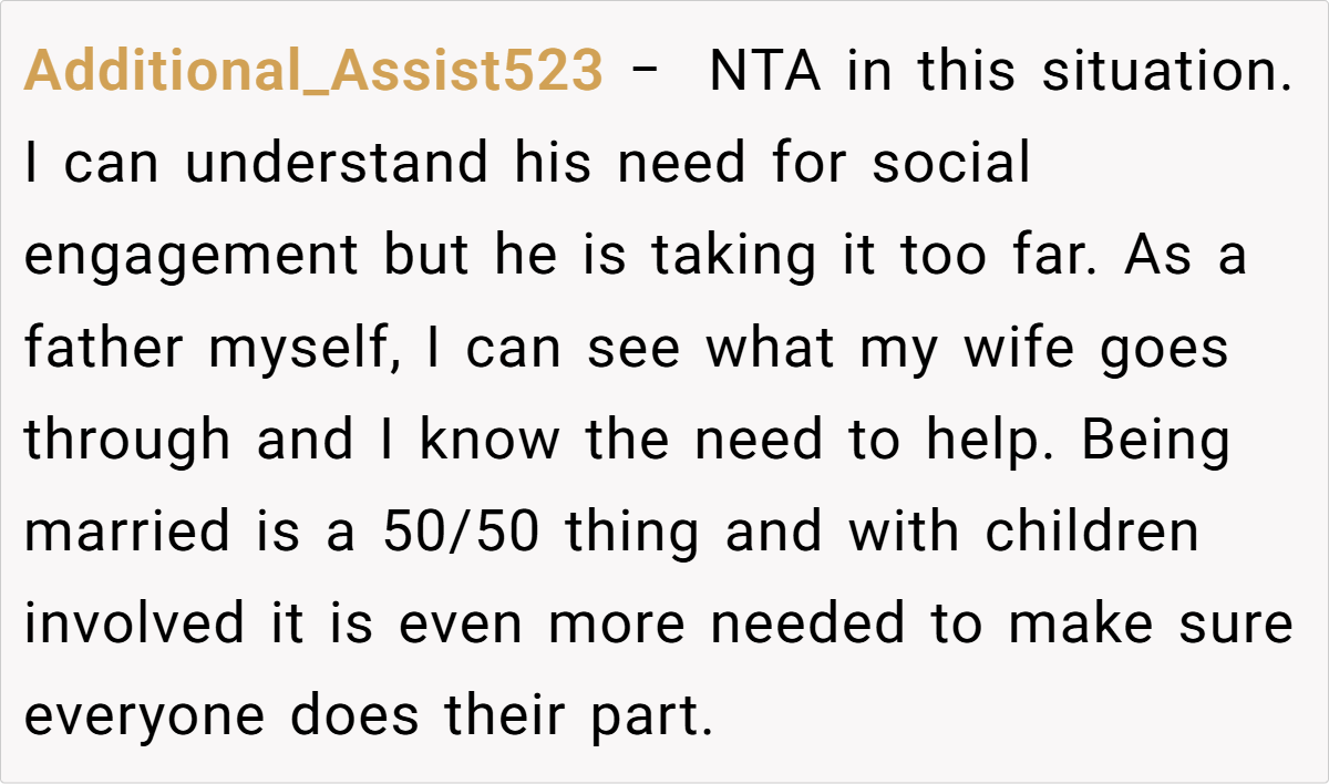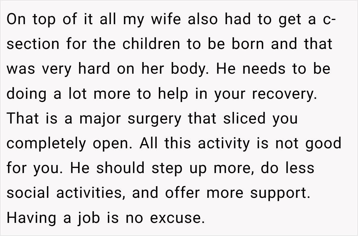 Across the board, community members agree that during the postpartum period—when the mother is recovering from major surgery and caring for very young children—support from both partners is non-negotiable. Many express strong disapproval of a partner who prioritizes social events over shared responsibilities, emphasizing that true partnership means sacrificing some personal time to help ease the burden on the other.