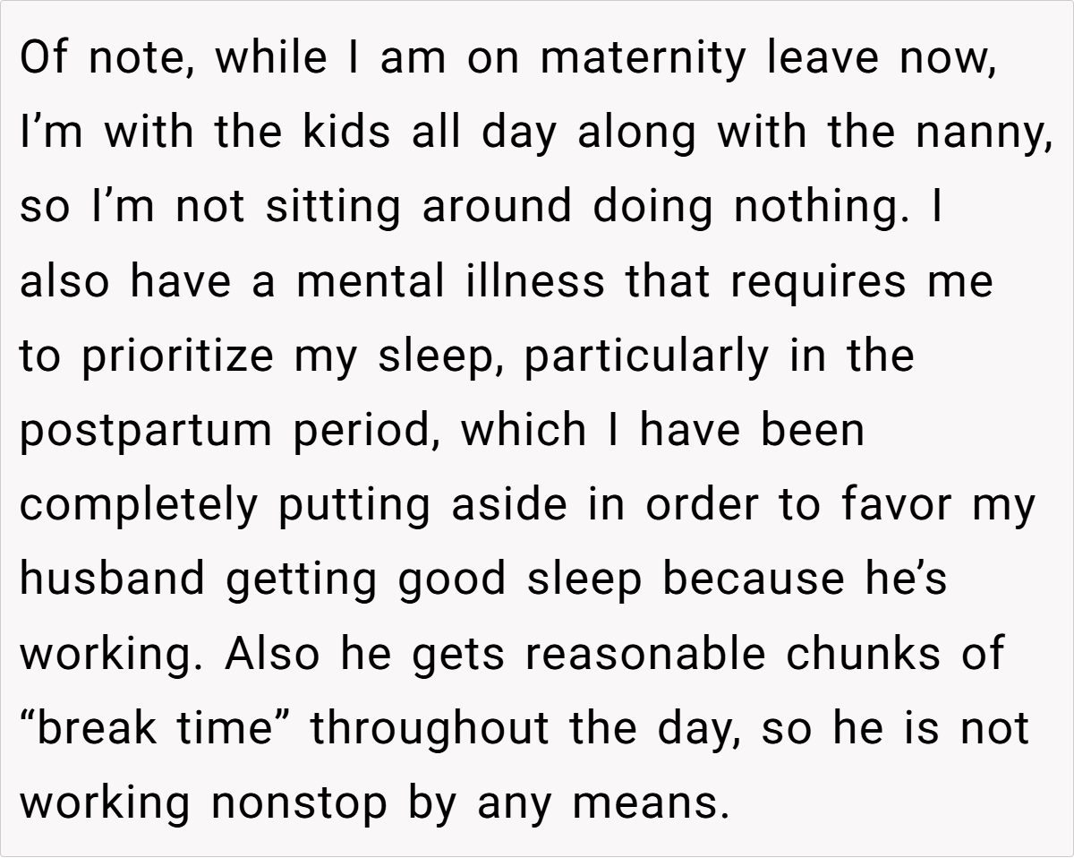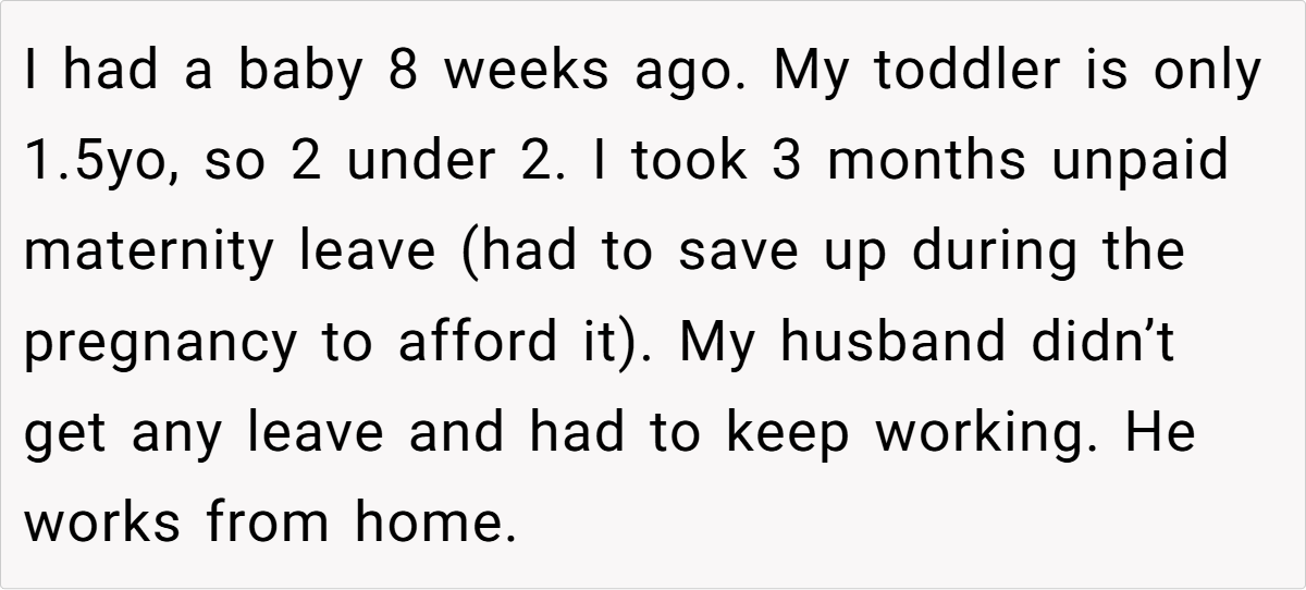 Eight weeks after giving birth, when you’re still healing from a C‑section and caring for a 1.5‑year‑old toddler, every extra hour of sleep can feel like gold. For one new mom, the reality is far from restful. While she’s been on three months of unpaid maternity leave—juggling her recovery and full days with her little ones—the situation at home has grown increasingly stressful. With the hired nanny leaving by early evening, she finds herself shouldering nearly all nighttime responsibilities.