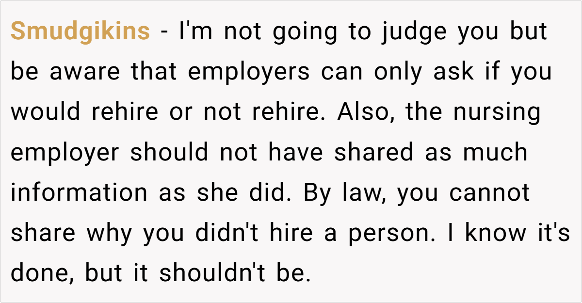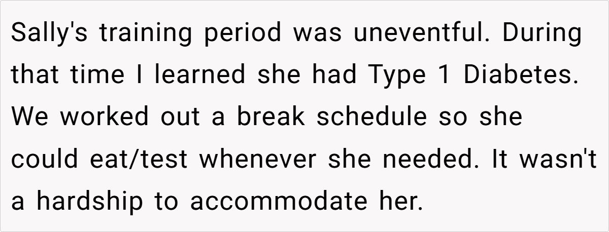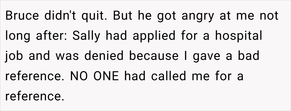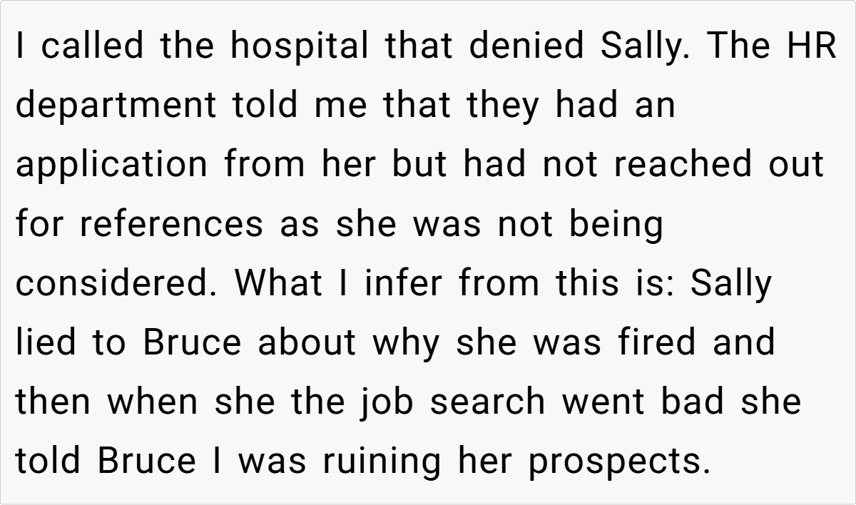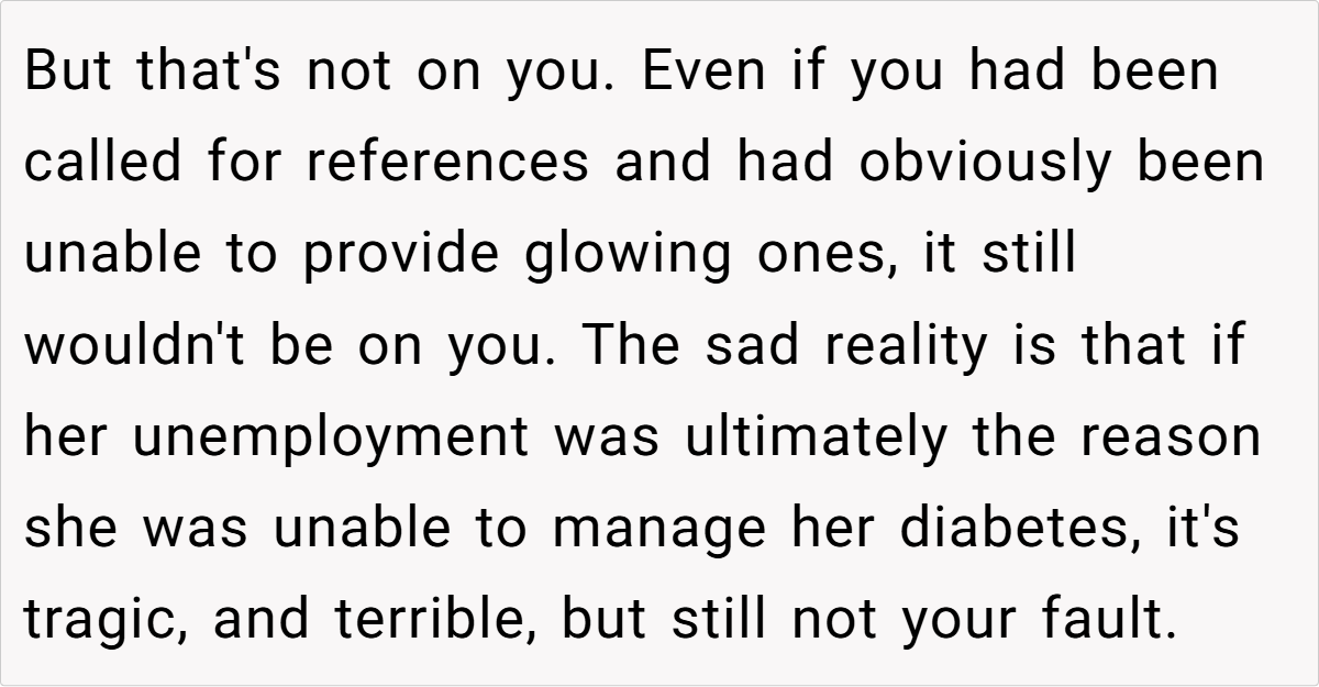 While OP didn’t sabotage Sally’s job prospects, her inability to secure employment could have had devastating consequences for her diabetes management. However, the hospital’s HR department confirmed they never even called OP for a reference, meaning Sally’s claims about OP ruining her chances were fabricated. Her death, while tragic, was not OP’s doing.