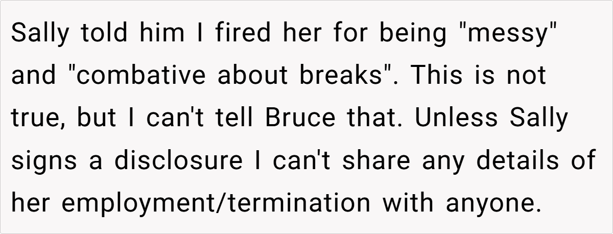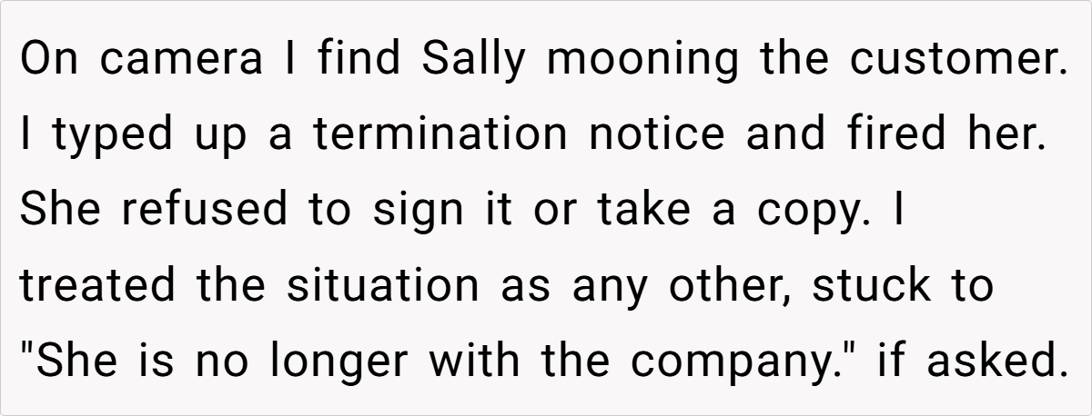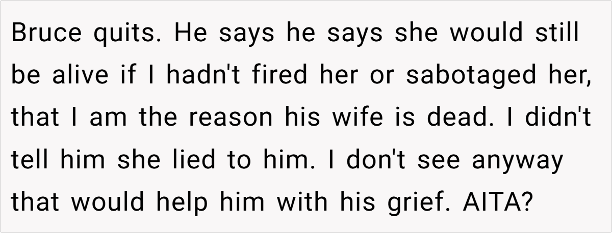 At its heart, this situation is a blend of workplace ethics, healthcare struggles, and the psychology of grief. Sally’s termination was a direct result of her own workplace behavior—her inappropriate comments to customers, refusal to perform basic job duties, and outright misconduct. However, Bruce, dealing with the emotional weight of losing his wife, redirected his grief into blame.