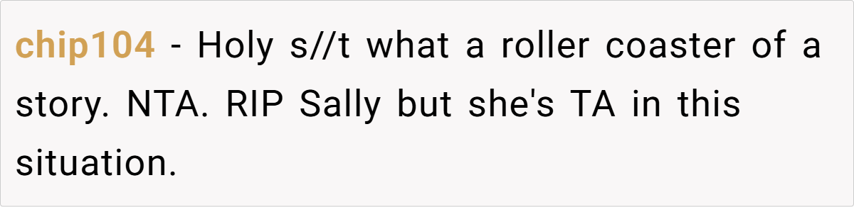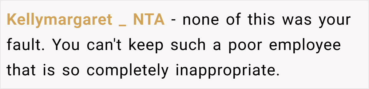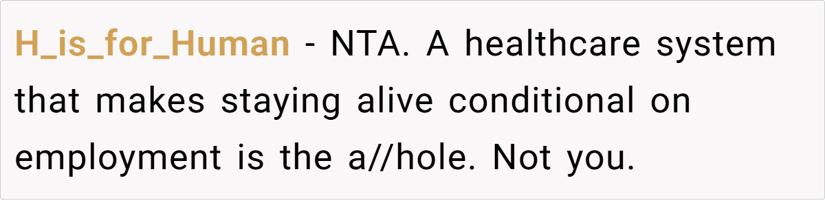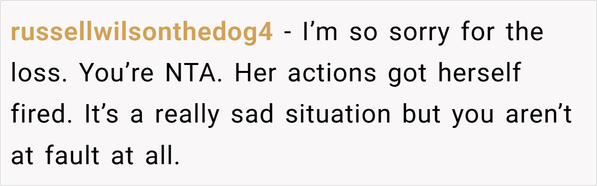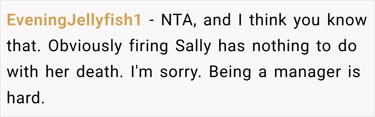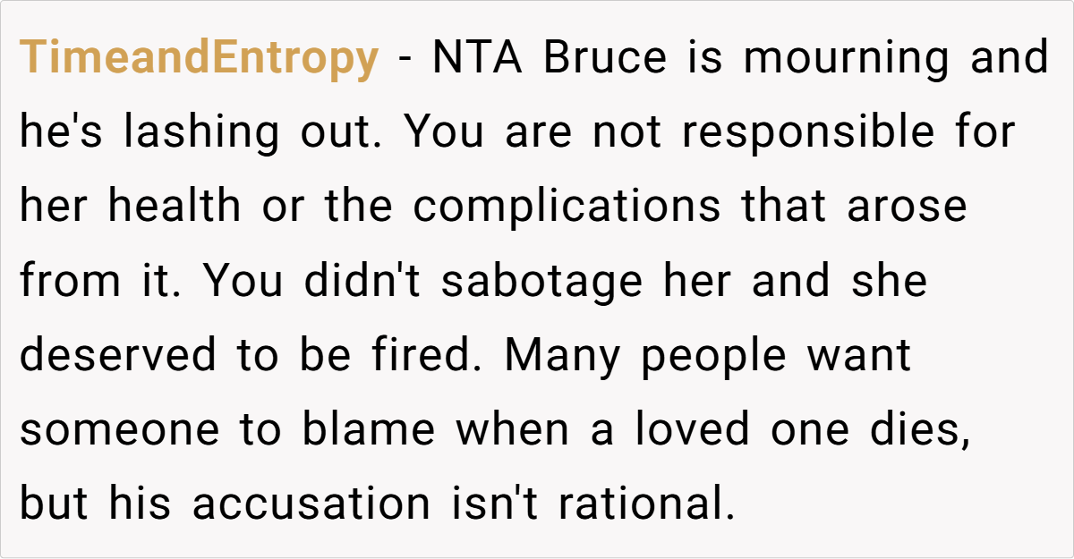 The general consensus? OP is not the a-hole. Many users pointed out that Sally’s behavior warranted termination and that Bruce’s misplaced blame was a result of grief rather than reality. Others highlighted the flaws in the healthcare system, emphasizing that the real villain in this story isn’t OP—it’s a system that ties medical access to employment.