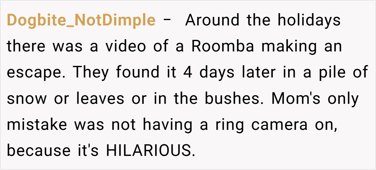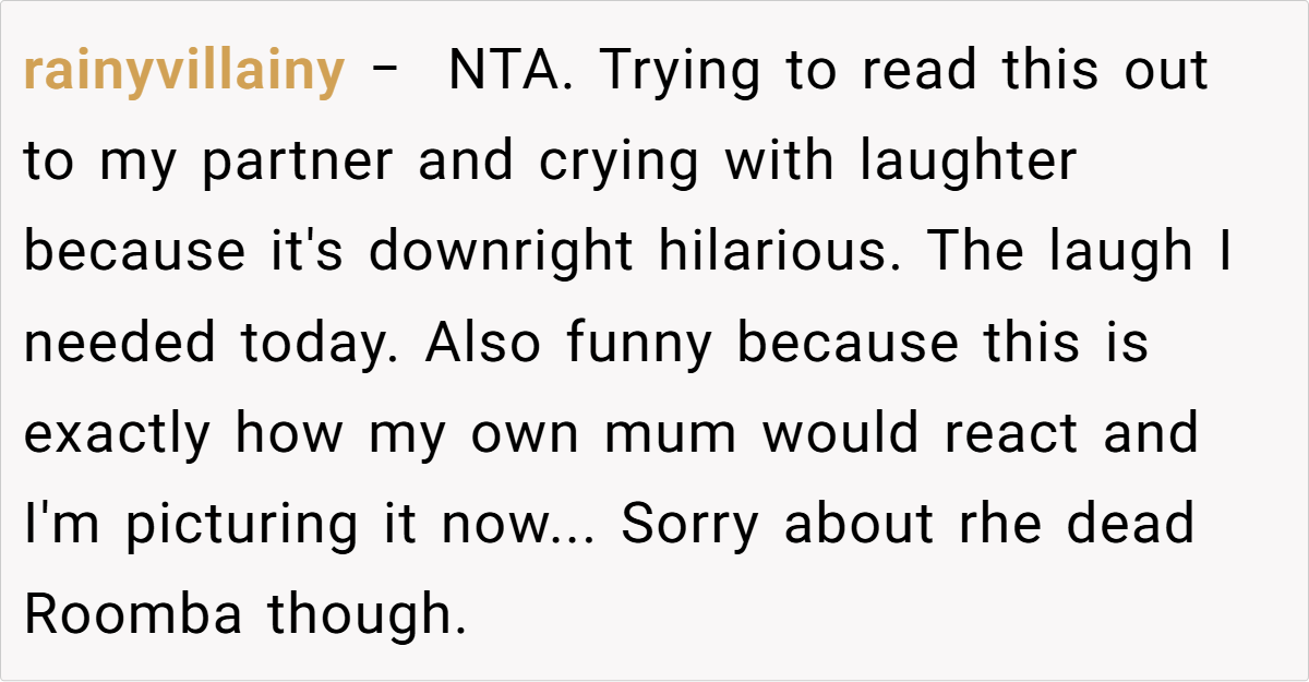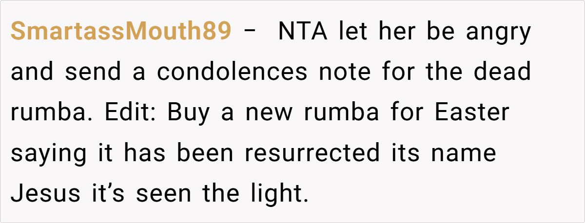 Furthermore, relationship experts suggest that the key to navigating these moments lies in effective communication. If the narrator had taken a moment to acknowledge his mom’s distress—perhaps by saying, “I know it’s unfortunate that your Roomba was damaged”—the humor might have been tempered with empathy, thus preserving the bond between them.