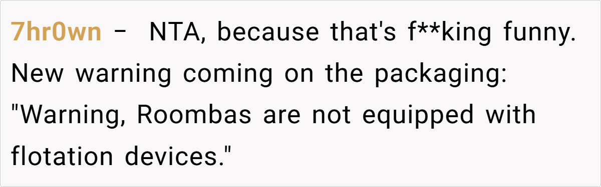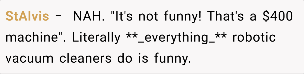 The conflict here underscores the complexity of humor in family dynamics. On one hand, laughing at an absurd situation—like a Roomba seemingly trying to escape a watery demise—can be a natural, cathartic response. On the other hand, when the humor is directed at a personal mishap that results in a financial loss, it can inadvertently hurt feelings, especially if the other party is already upset.