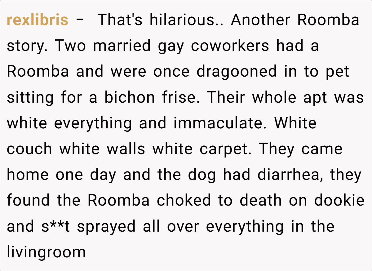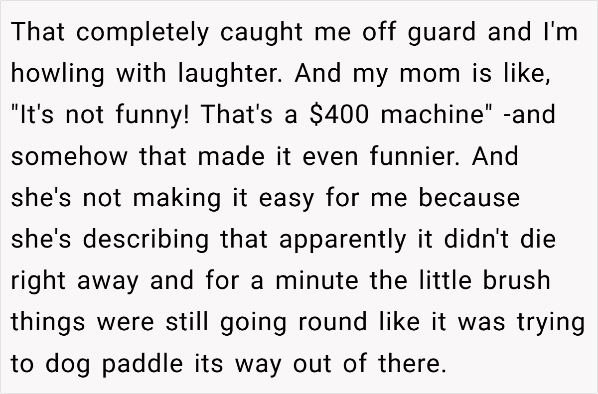 The story takes an unexpected twist when the Roomba, instead of shutting down immediately, appears to “dog paddle” for a minute before finally succumbing to the water. Caught completely off guard, the narrator erupts in laughter, leaving his mom fuming over the loss of her $400 machine and the lack of a safety feature to save it.