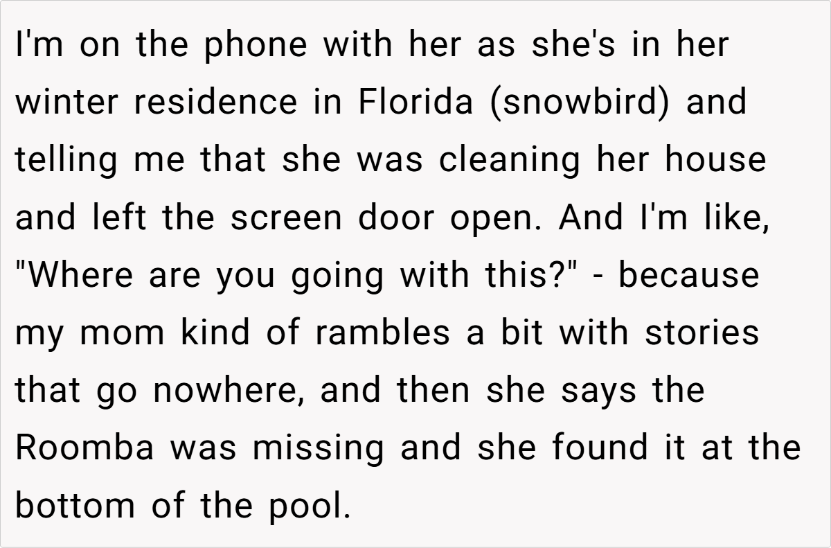 Family anecdotes often make us burst into laughter, but sometimes, the timing and context can turn humor into a bone of contention. In this post, the narrator recounts a moment on the phone with his mom—a snowbird living in Florida—who excitedly describes how her Roomba went missing and was later found at the bottom of her pool.