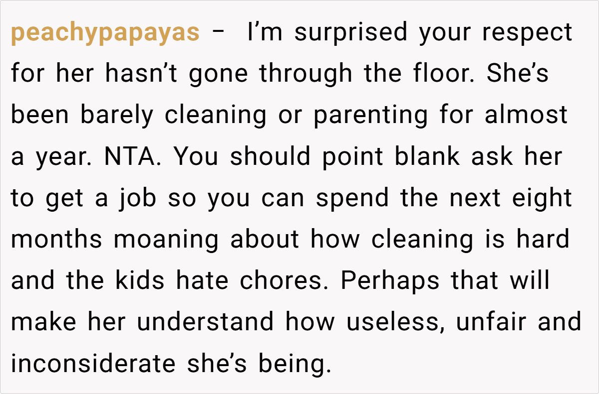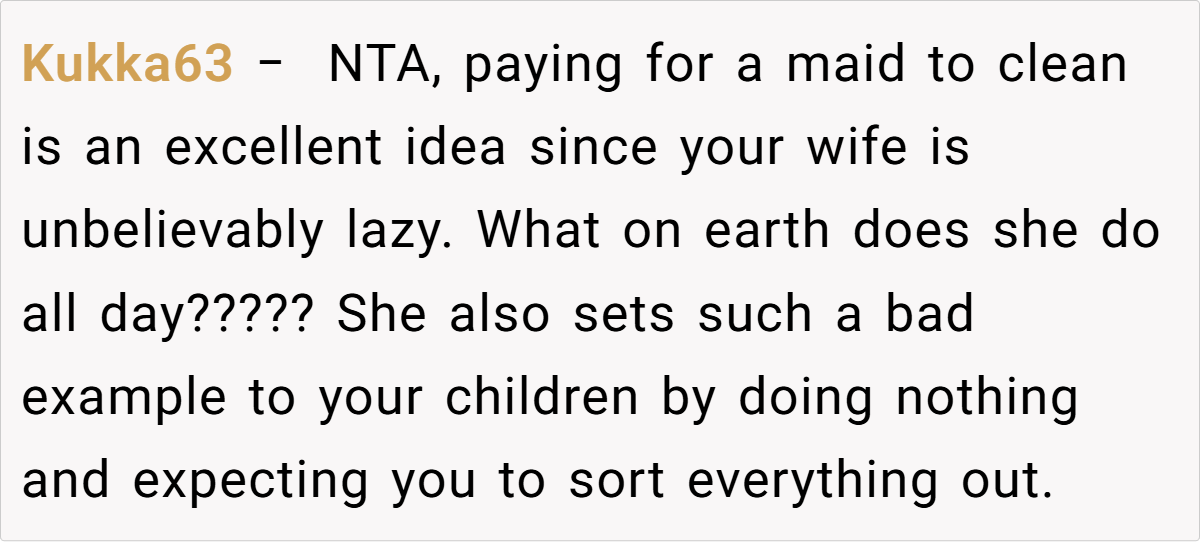 Many redditors have weighed in on the post, with some applauding the husband’s proactive stance while others question whether a maid truly addresses the underlying issues. The comments range from playful jabs at traditional gender roles to serious reflections on parental responsibility and fairness. These diverse opinions reveal that while online voices can be sharp and witty, they also mirror the real challenges many families face in balancing work, life, and household demands.
