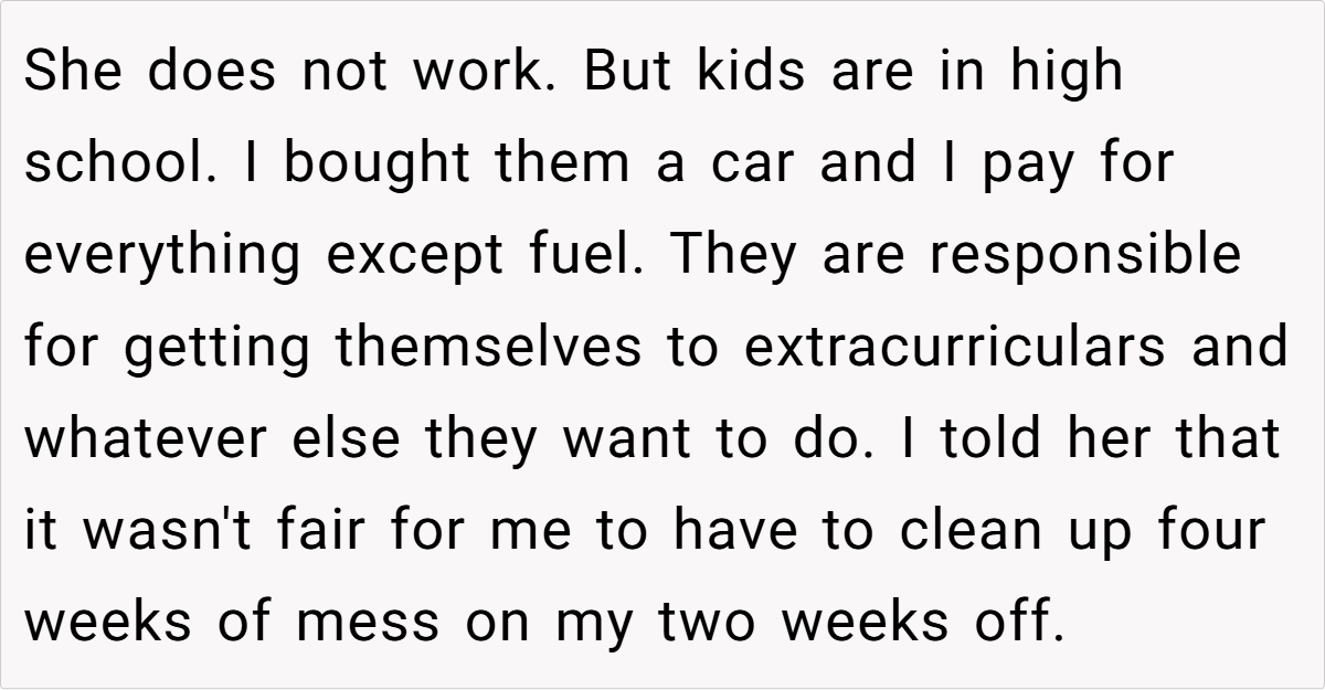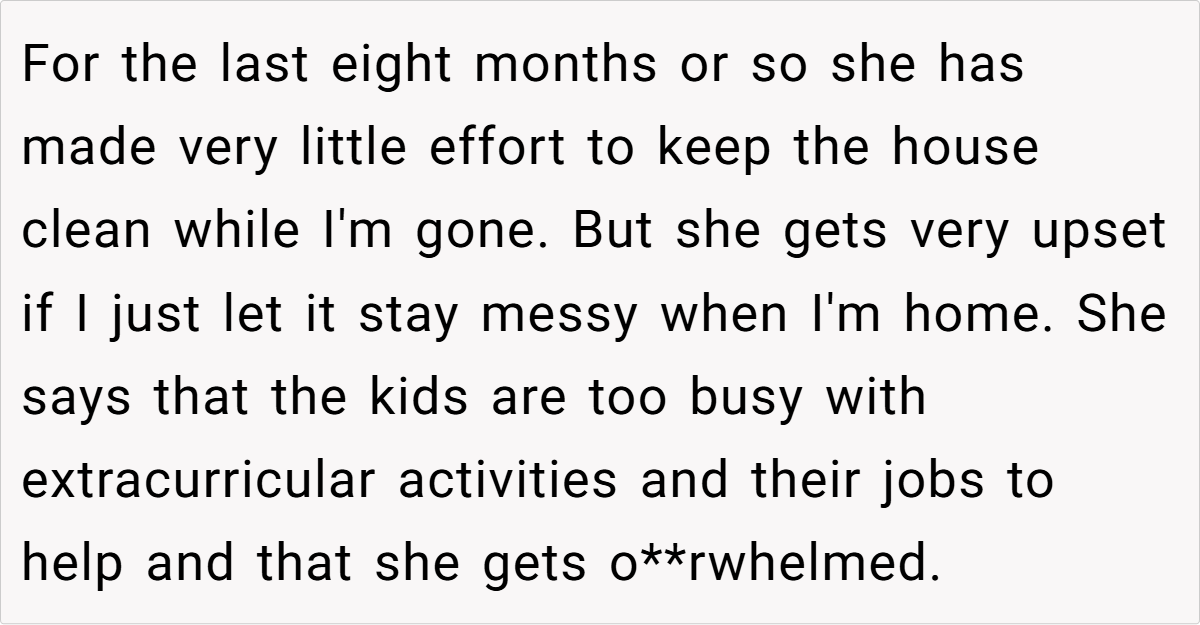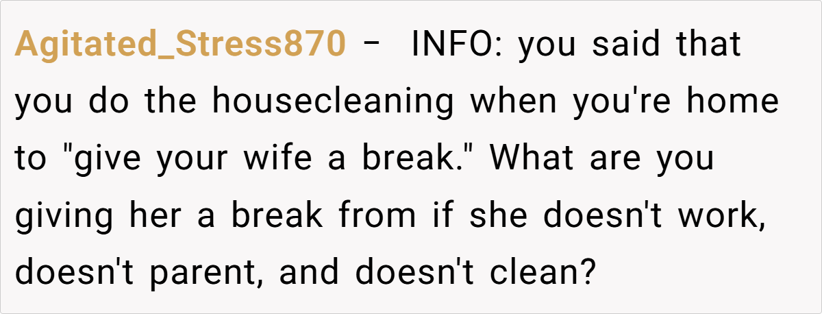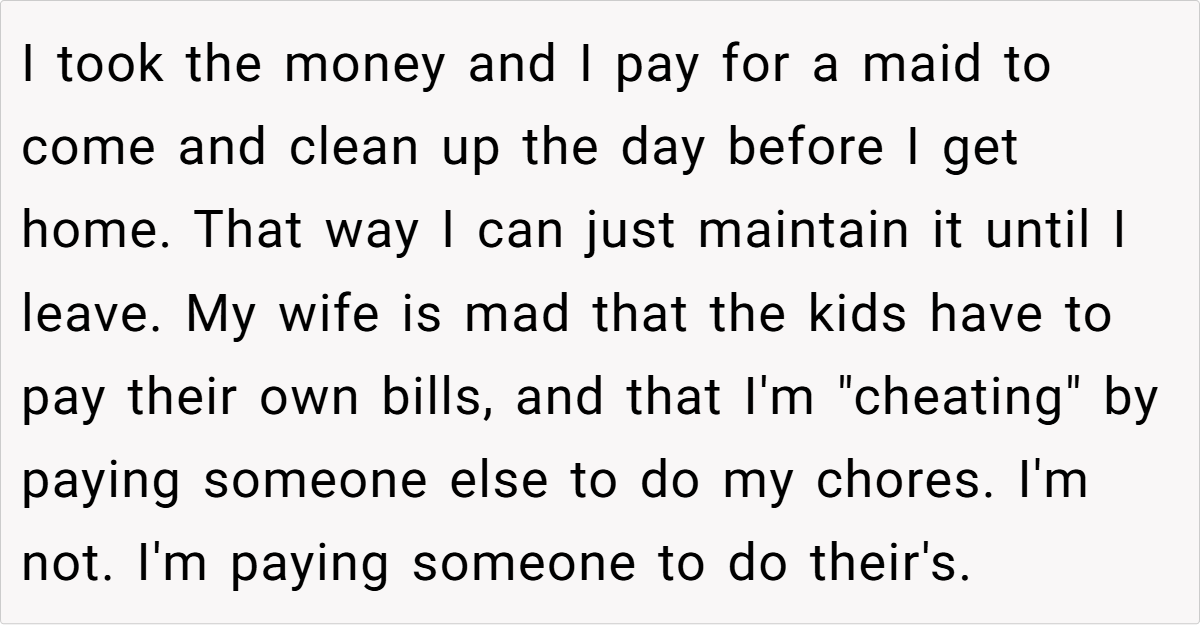 Letting a simple chore become a battleground highlights the modern challenges many couples face. In this scenario, the husband’s decision to hire a maid stems from frustration over accumulating mess during his limited time at home. He believes that his wife should enforce the kids’ contributions to household chores. Yet, this move has led to accusations of “cheating” and further internal strife. The situation underscores how misaligned expectations can disrupt even the most well-intentioned family arrangements.