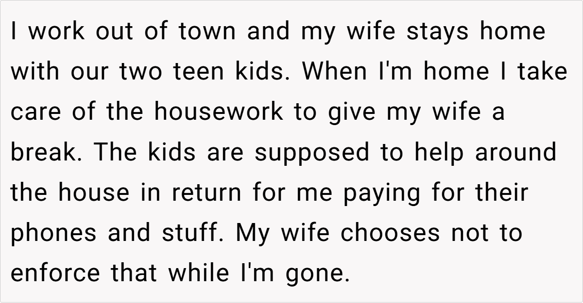 In today’s fast-paced world, balancing work, family, and household responsibilities can feel like juggling flaming torches. One Redditor’s post has ignited a debate on what’s fair in the marriage of modern times. Here, a husband who works out of town finds himself caught in a domestic tug-of-war—managing housework during his brief home visits while his wife, tasked with keeping the home tidy alone, leaves things to pile up. The ensuing conflict over paying for a maid to clean up the mess speaks volumes about expectations, responsibilities, and the evolving dynamics of family life.