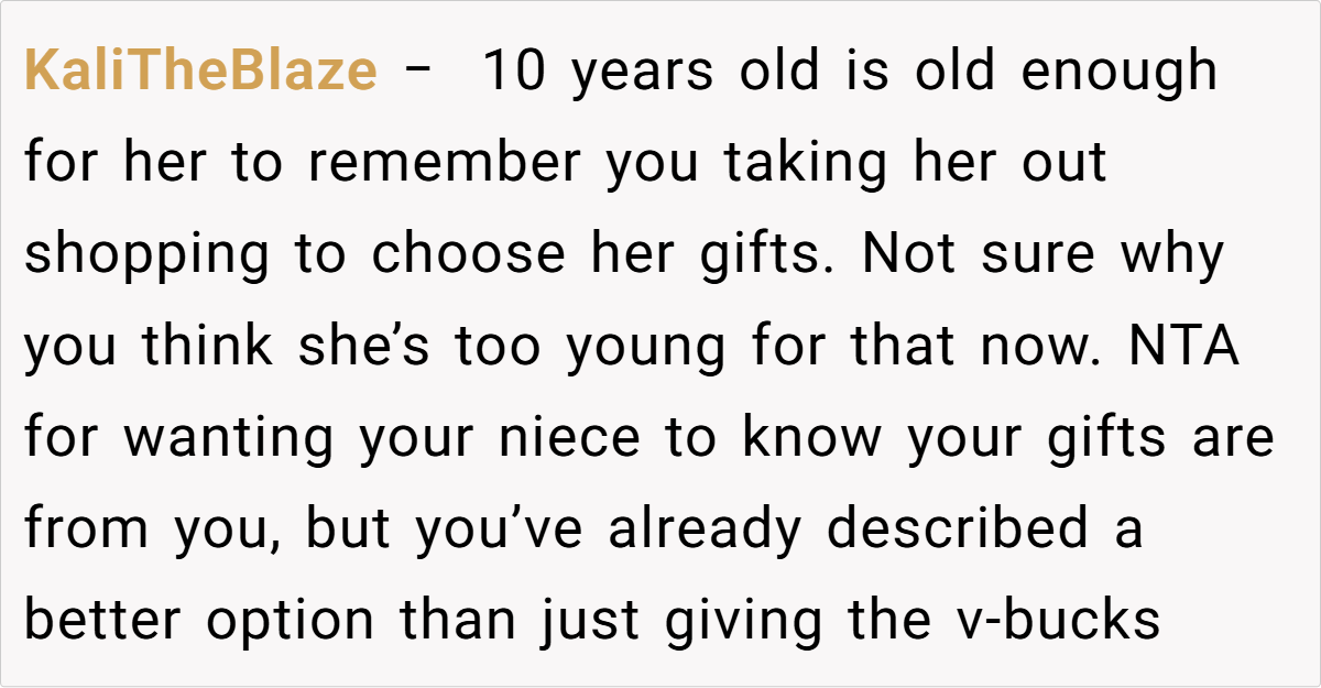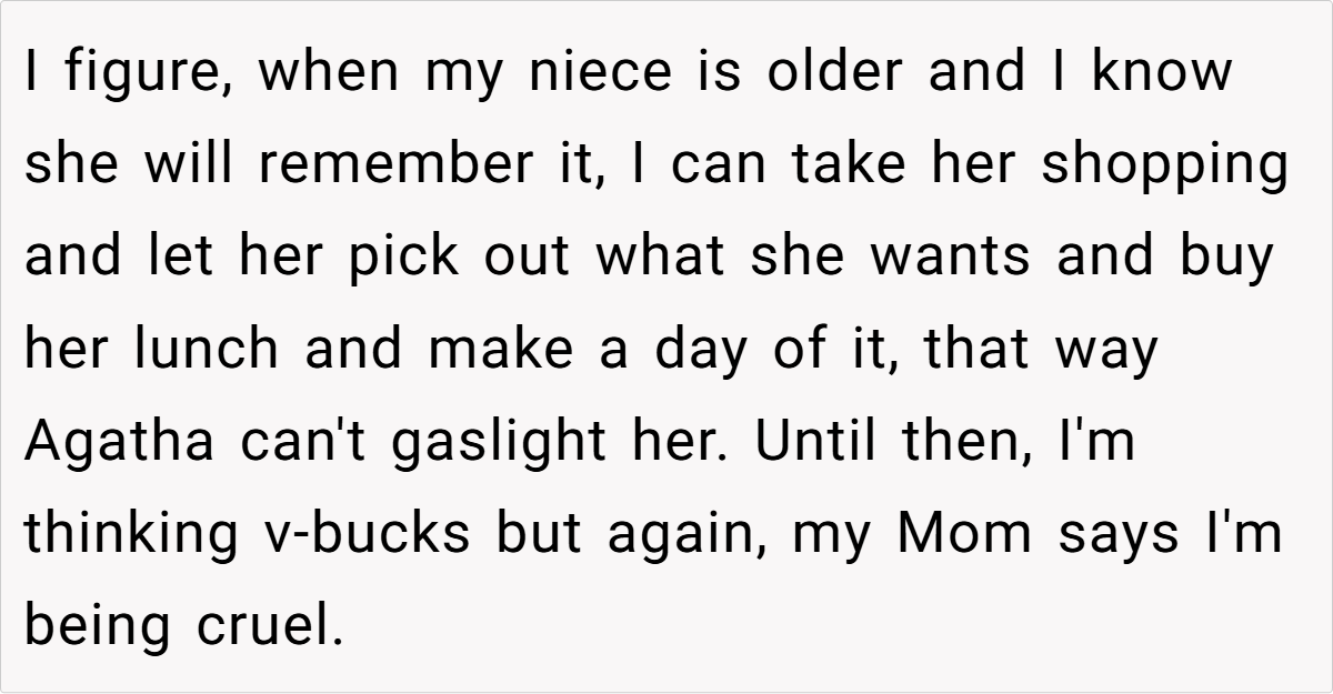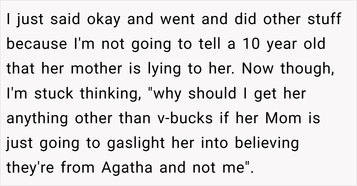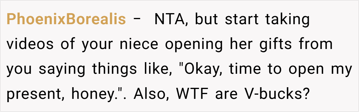 Family dynamics expert Dr. John Gottman notes that when manipulation infiltrates cherished family traditions—such as gift-giving—it’s crucial to establish clear boundaries to maintain authenticity. In this case, the relative’s choice to limit her gifts to V-Bucks is a strategic response to a recurring pattern: her thoughtful presents are consistently being misattributed by Agatha.
