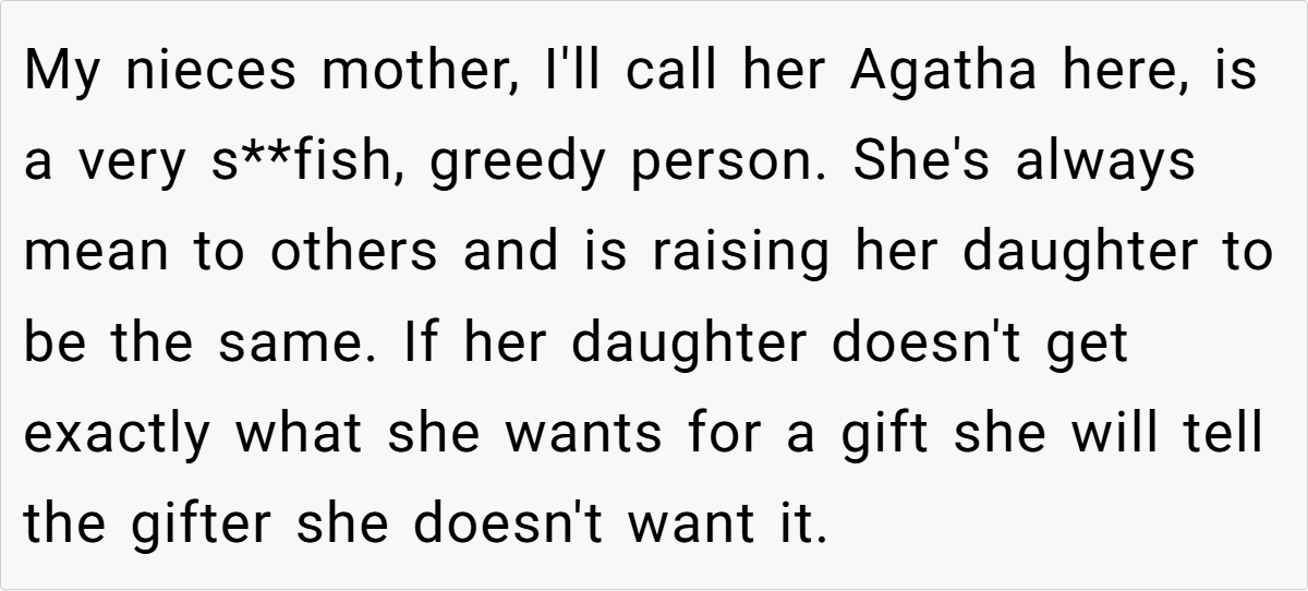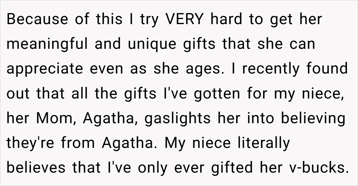 Gift-giving is meant to be a heartfelt expression of care, but what happens when those gestures are manipulated? In this case, the narrator—a devoted relative—shares her frustration over her niece’s birthday presents being misattributed by her mother, Agatha.