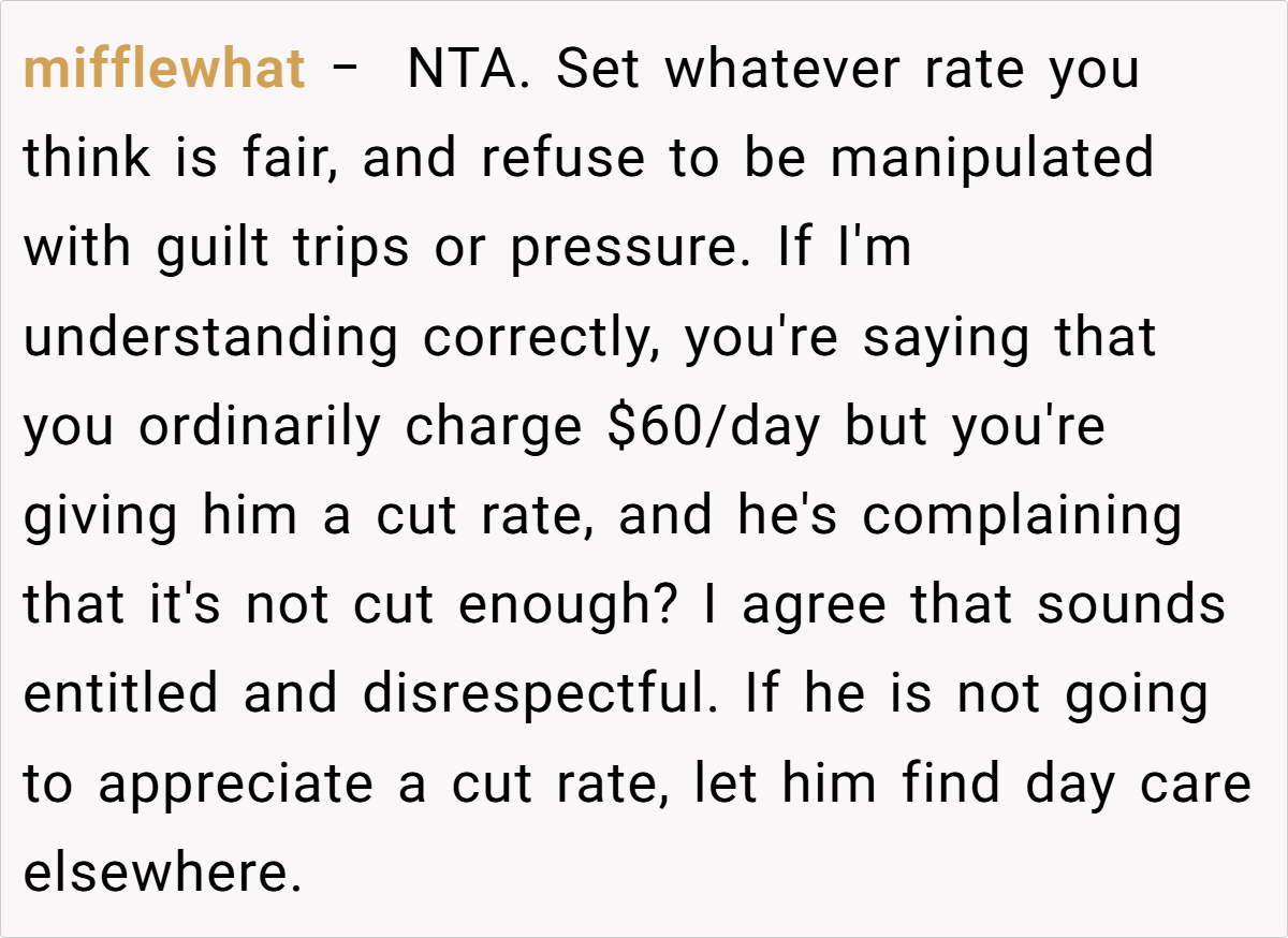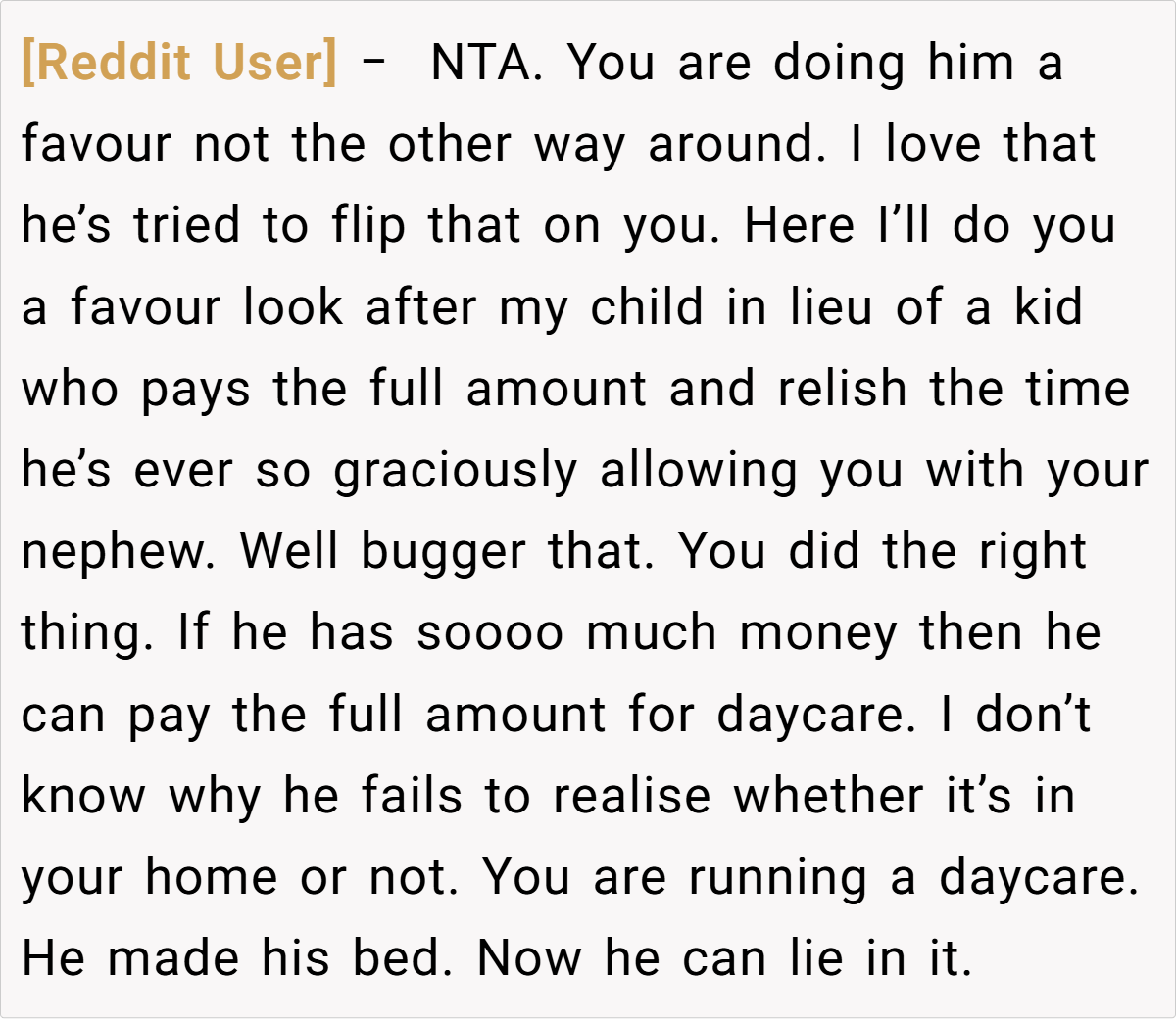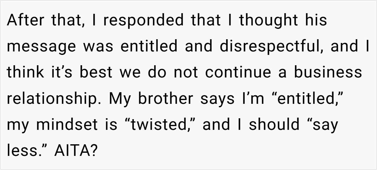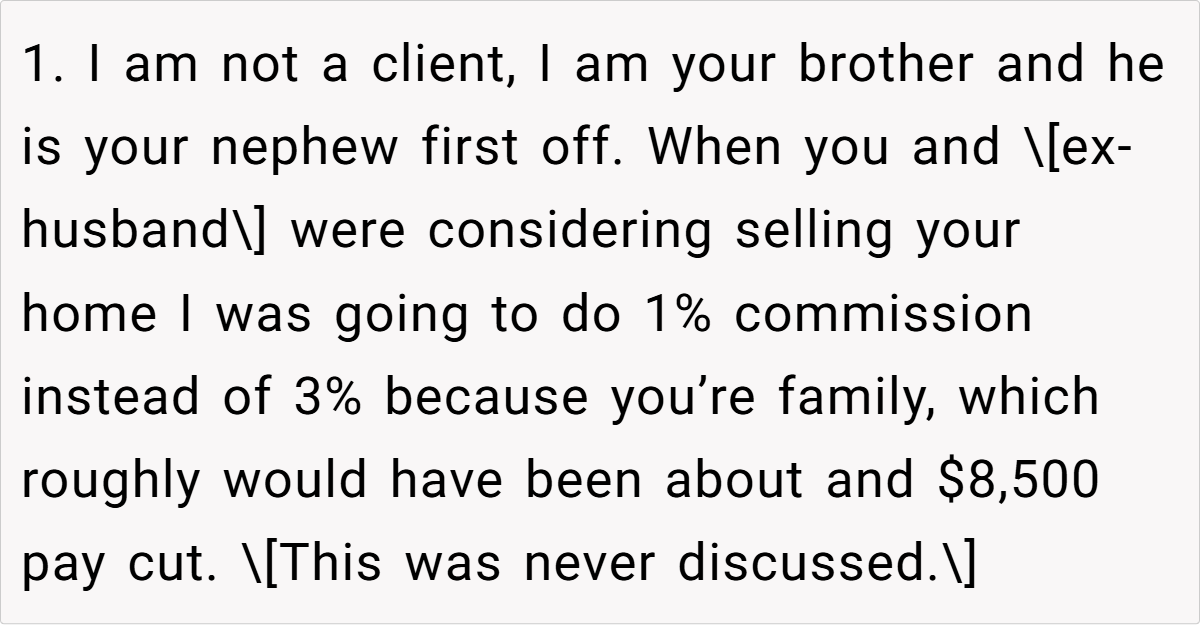 In summary, the broader Reddit community largely sided with the host mom. Commenters expressed that mixing family with business is a recipe for conflict, and that a clear, fair fee should have been agreed upon from the start. Many felt that the brother’s aggressive tone and unreasonable expectations highlighted a broader issue of entitlement. The consensus was clear: family relationships should never be exploited for financial favors, and if boundaries aren’t respected, it might be best to keep business separate from family affairs.