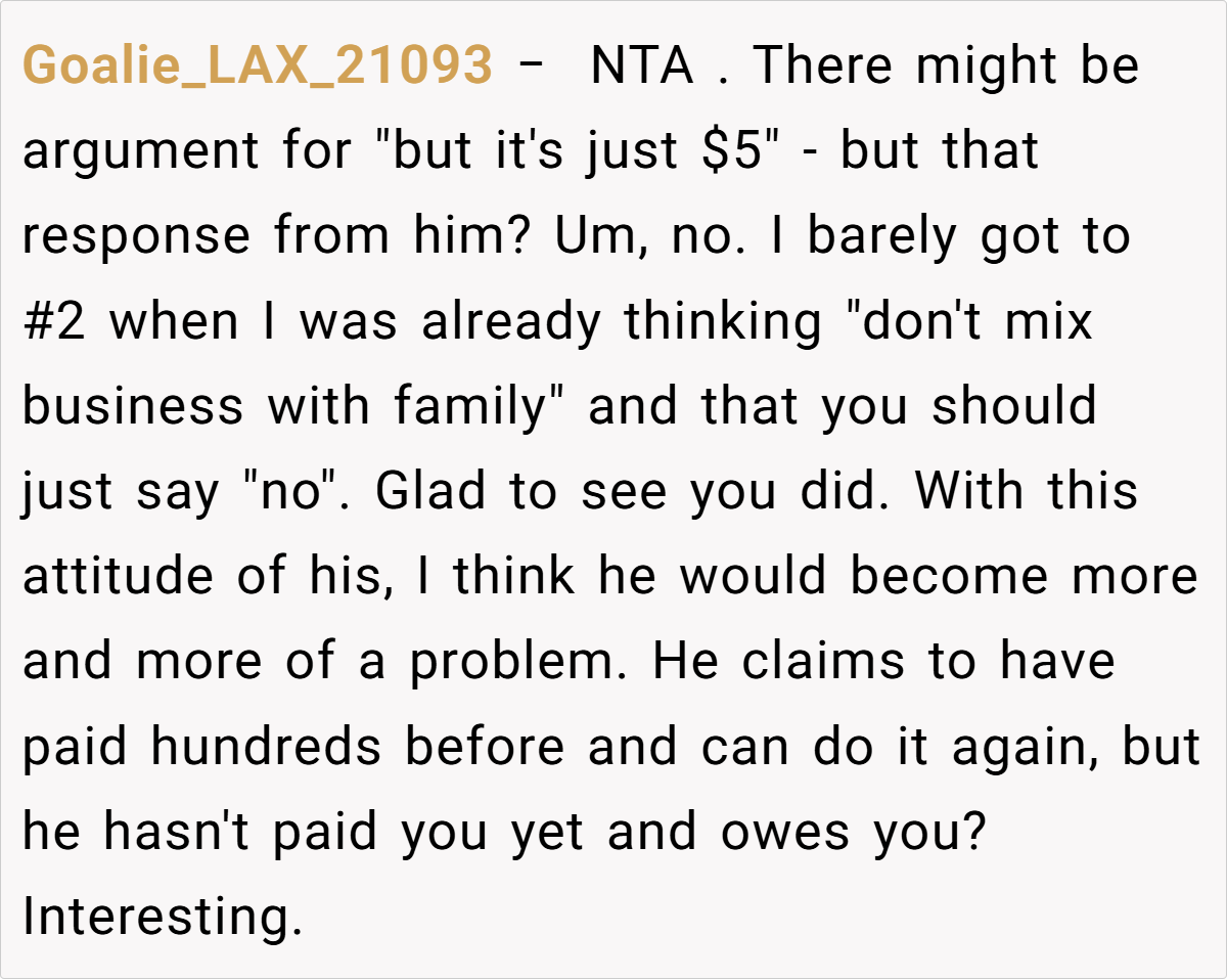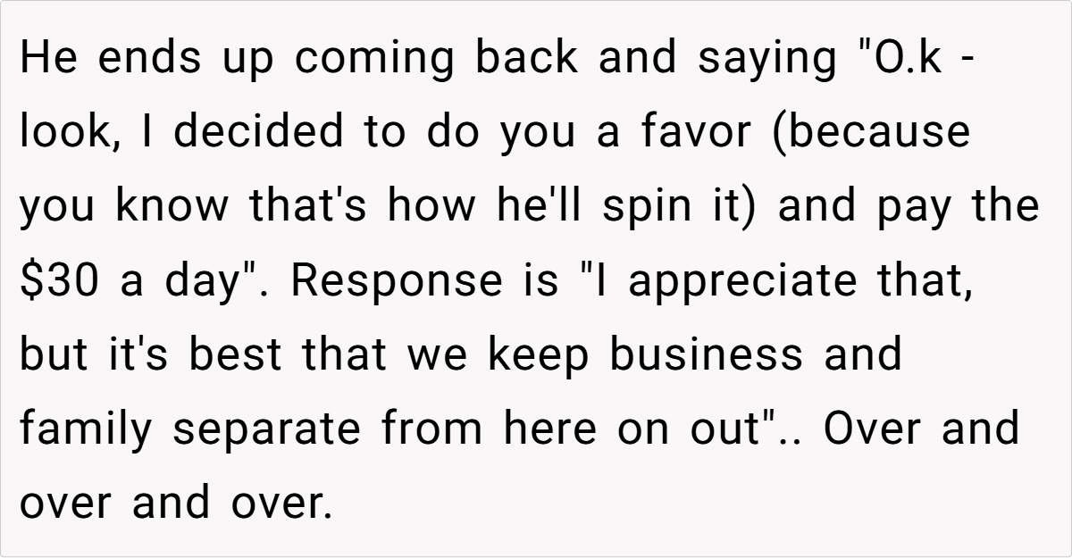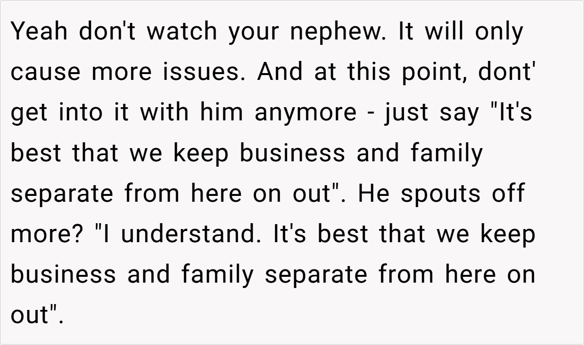 In summary, the broader Reddit community largely sided with the host mom. Commenters expressed that mixing family with business is a recipe for conflict, and that a clear, fair fee should have been agreed upon from the start. Many felt that the brother’s aggressive tone and unreasonable expectations highlighted a broader issue of entitlement. The consensus was clear: family relationships should never be exploited for financial favors, and if boundaries aren’t respected, it might be best to keep business separate from family affairs.