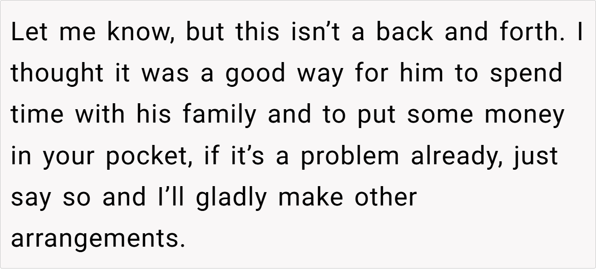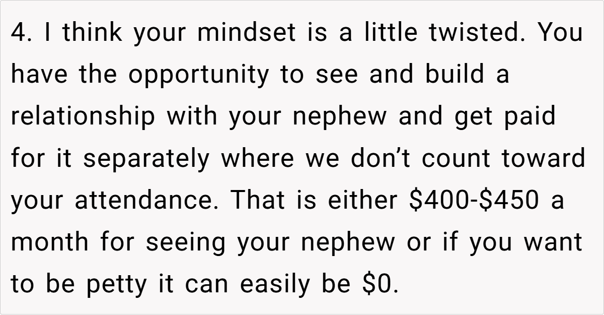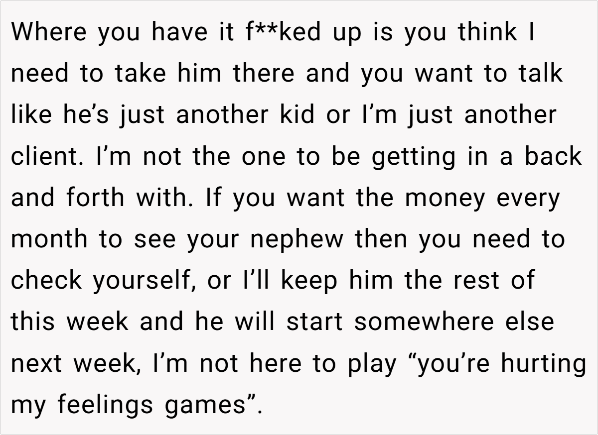 The host mom’s argument for charging a more reasonable fee reflects her need to maintain the professional value of her services, despite the familial bond. At the same time, her brother’s counterpoints reveal a mindset that confuses familial obligation with financial concessions.