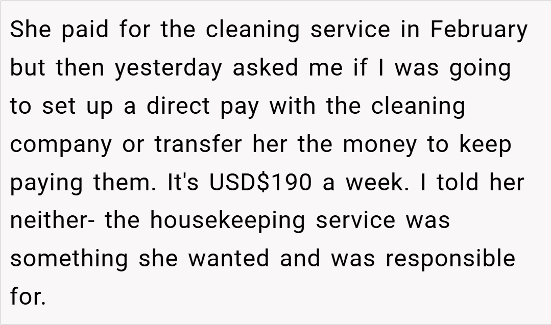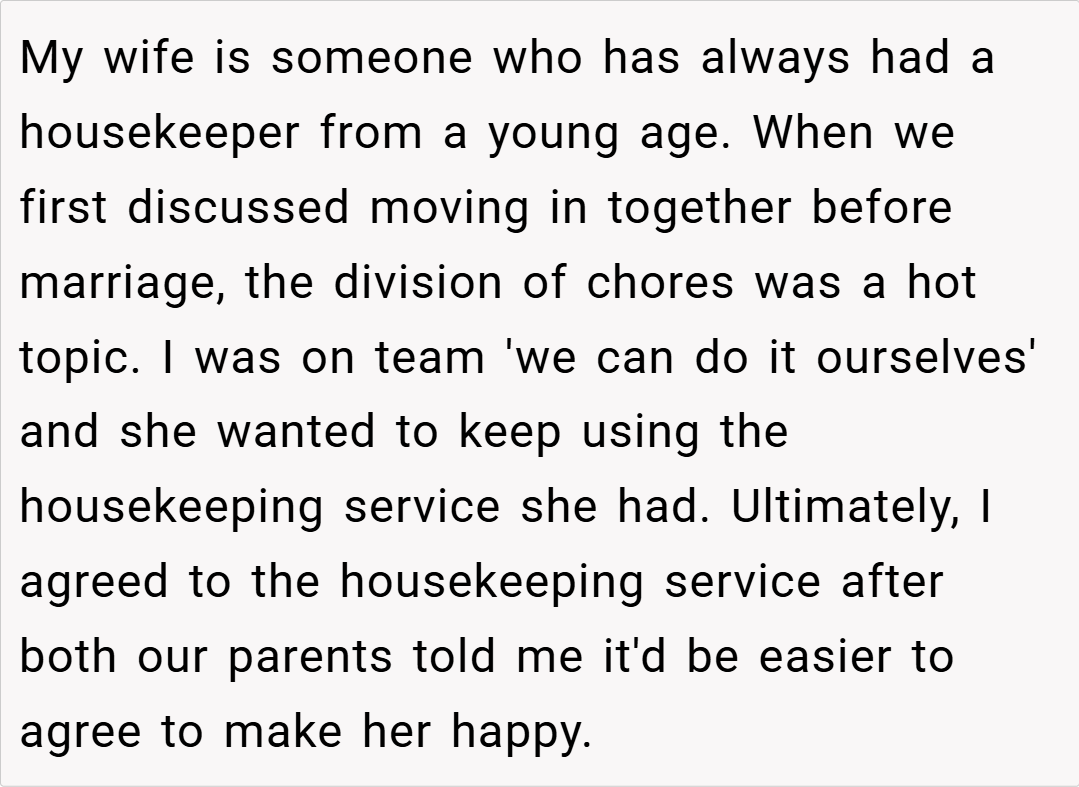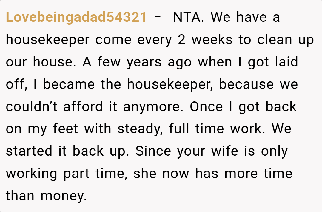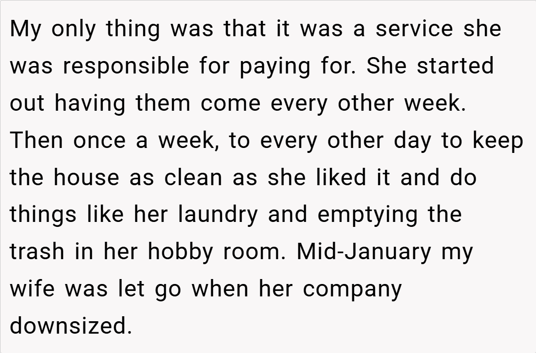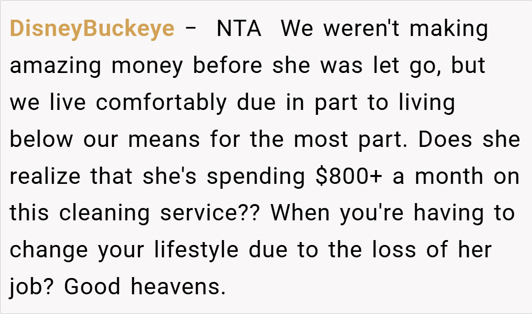 In every household, there comes a time when budget decisions force us to reconsider our lifestyles. Here we have a story about a husband who once agreed to a luxury he knew his wife loved—a professional housekeeping service. But when financial realities shifted after his wife lost her job, he decided that spending nearly two hundred dollars a week on cleaning was a luxury they could no longer justify. This decision has sparked heated debates and left one partner feeling unheard.