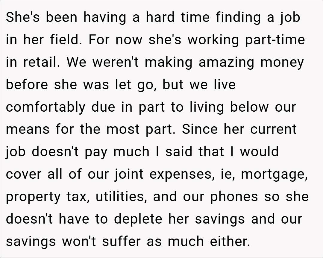 In this situation, the husband’s refusal to cover the full cost of a luxury service highlights the need for partners to reassess their financial priorities together. With one income taking a hit, every dollar counts. By insisting that the expense is not a joint necessity, he aims to protect their savings and promote a more sustainable lifestyle. This approach, though seemingly harsh, is rooted in a desire for fiscal responsibility.
