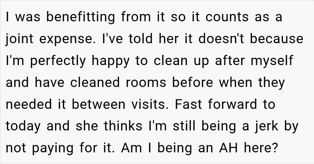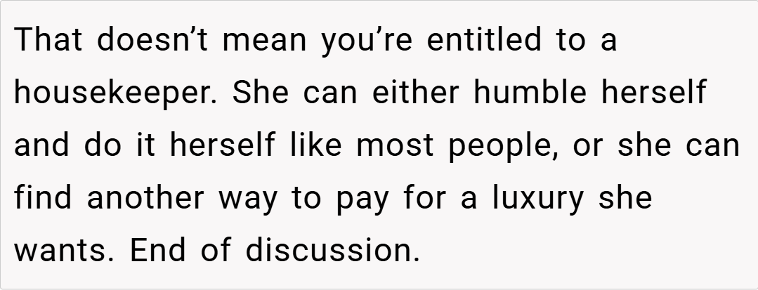 Living comfortably on a modest income means making tough calls on what expenses are essential and which ones are optional. Our storyteller chose practicality over indulgence, insisting that two able-bodied adults can manage a tidy home on their own. His stance may seem blunt, but it also raises important questions about sharing financial responsibilities fairly, especially when circumstances change.