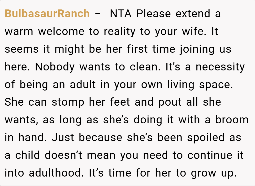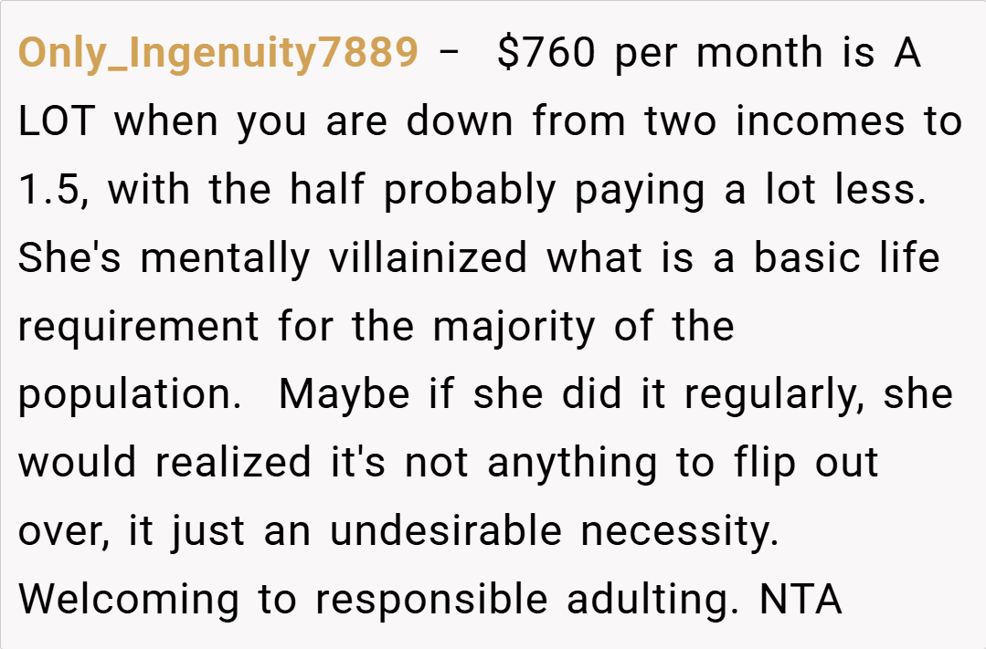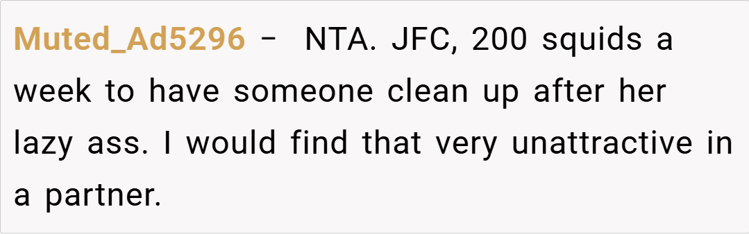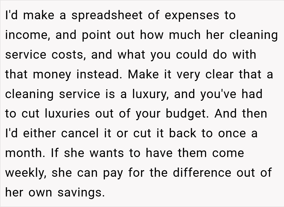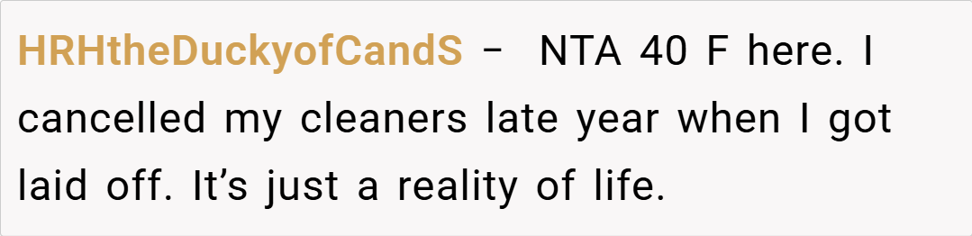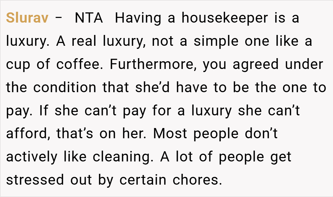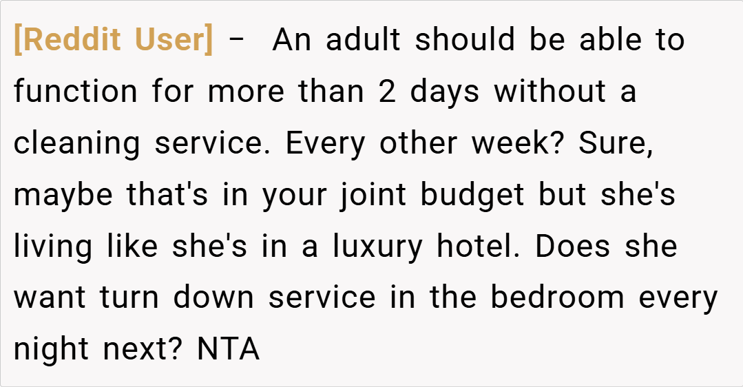 Here are some hot takes from the Reddit community—candid, humorous, and refreshingly blunt. The comments reveal a consensus that a housekeeping service, at nearly USD$190 per week, is indeed a luxury rather than a necessity. While some suggest cutting back gradually, others argue that facing the reality of adult responsibilities is a necessary step.