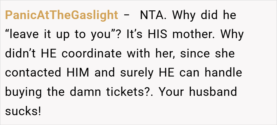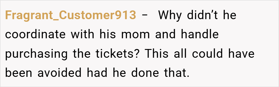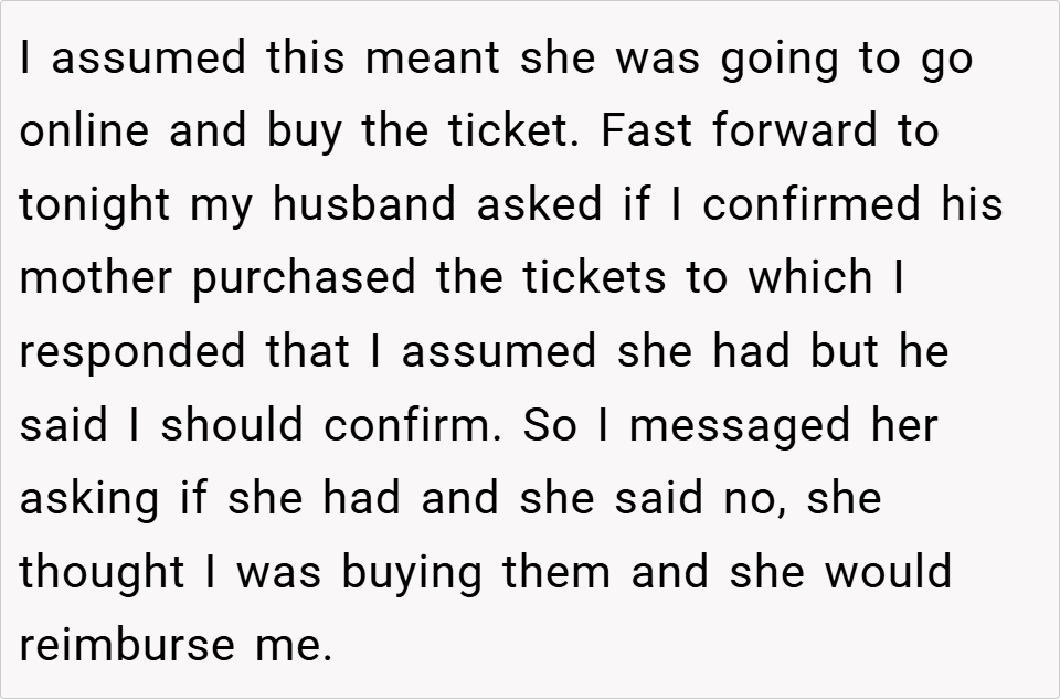 This situation highlights how easily miscommunications can escalate, especially when family dynamics are involved. While the writer’s assumption was reasonable, her husband’s reaction was overly critical and unkind. The incident serves as a reminder of the importance of clear communication and the need to approach misunderstandings with empathy rather than blame. What do you think? Was the writer wrong to assume her MIL would buy the tickets, or was her husband overreacting?