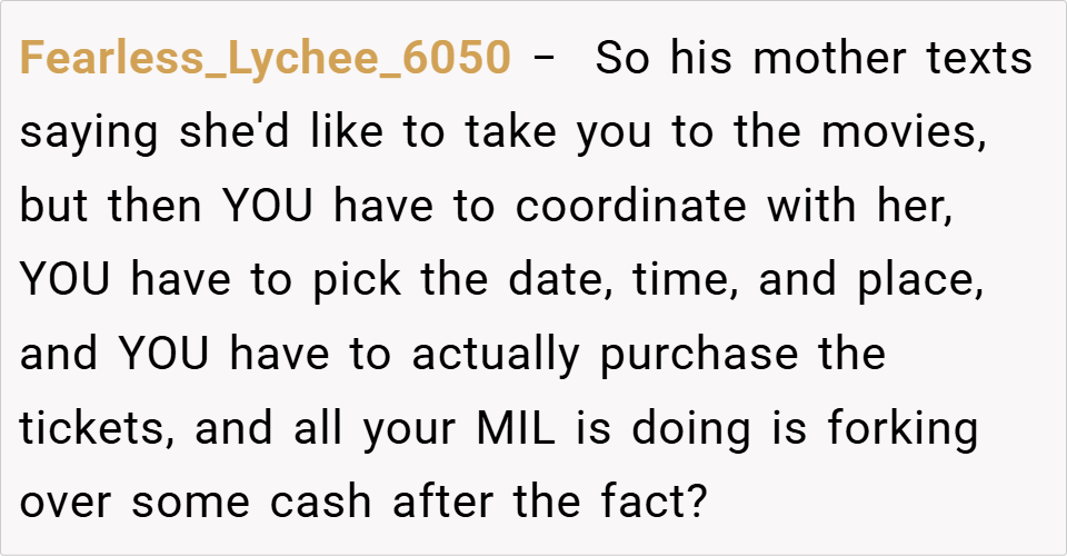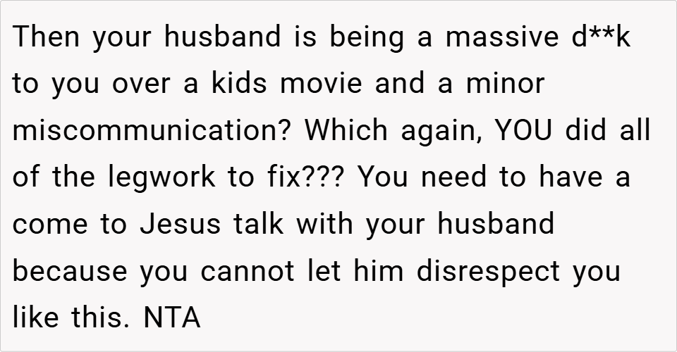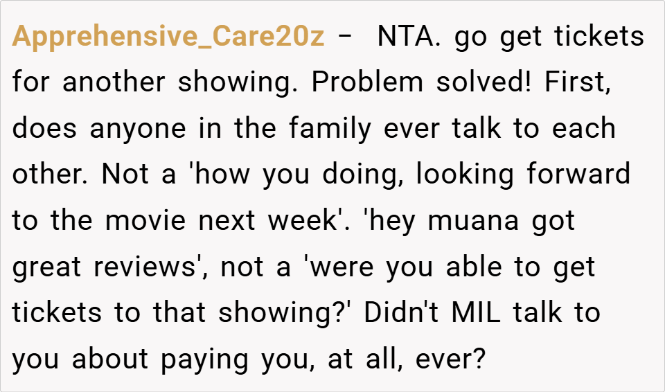 Reddit’s response split into three camps, though the majority sided with OP. Critics questioned why OP didn’t double-check ticket logistics sooner, arguing that assuming the MIL would buy them was a “risky move.” However, these voices were drowned out by supporters, who slammed the husband for weaponizing a simple miscommunication. As one user put it, “He’s mad about a sold-out Disney movie? Grow up.” A minority mocked the pettiness of the conflict, likening it to “a soap opera over popcorn,” while others zeroed in on the husband’s failure to handle his own mother: “Why didn’t HE coordinate with her? He’s the AH here.”