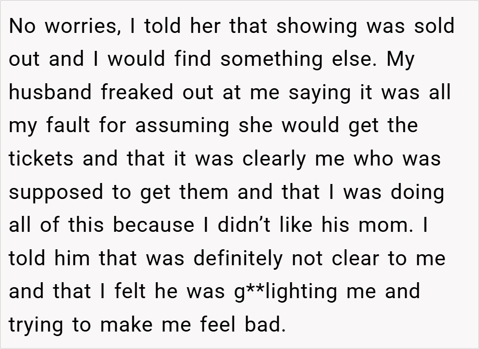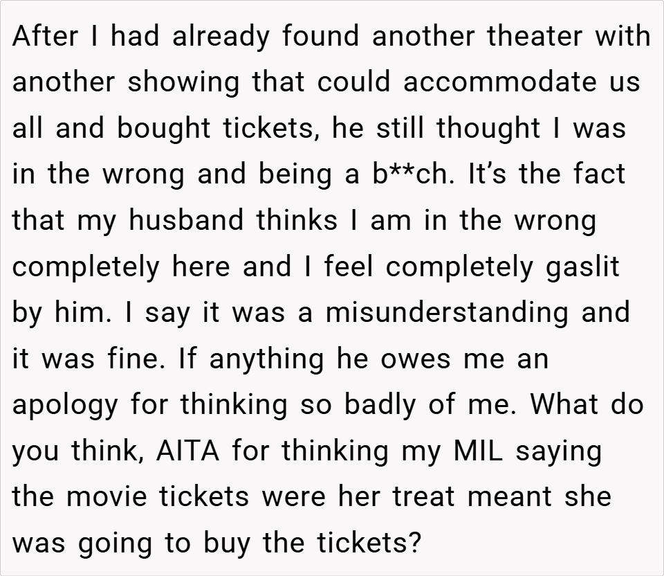 While she believed her mother-in-law’s offer to “treat” meant she would purchase the tickets, her husband accused her of being at fault for not clarifying. Was she wrong to assume, or was her husband overreacting? Read the full story below.