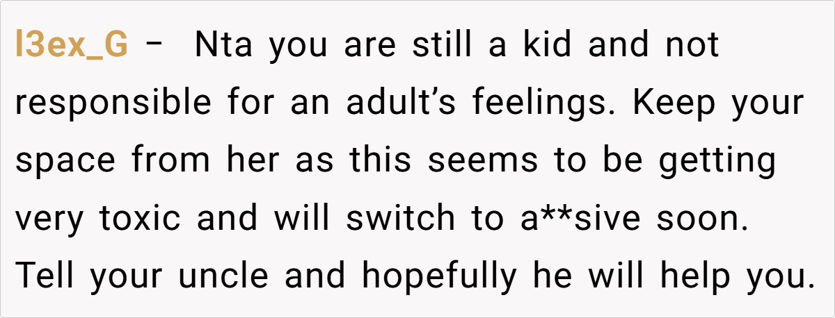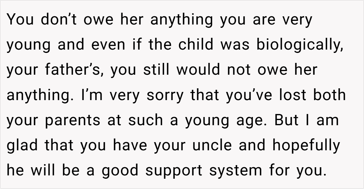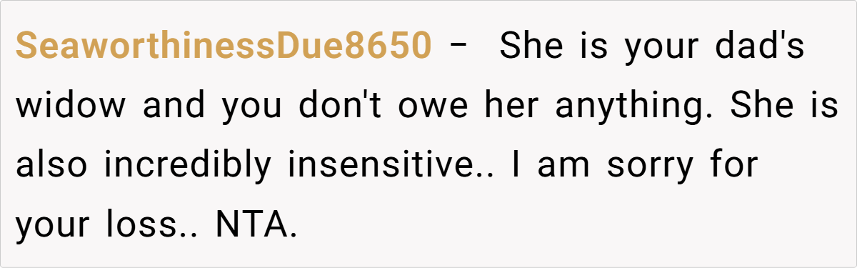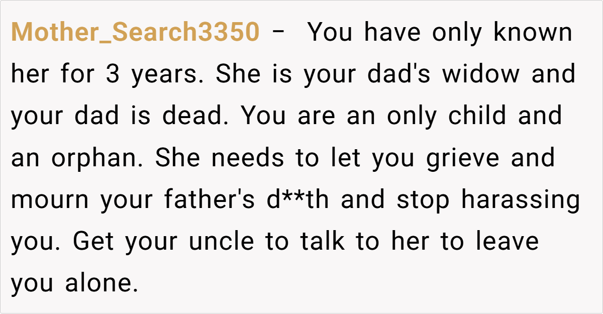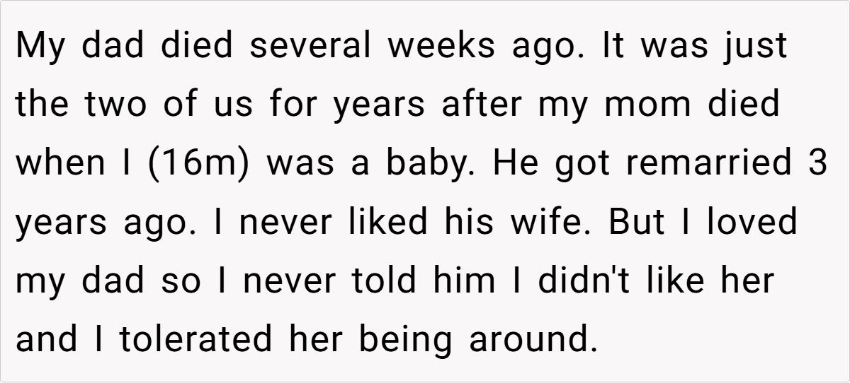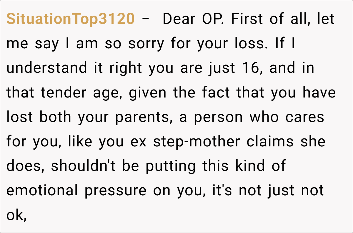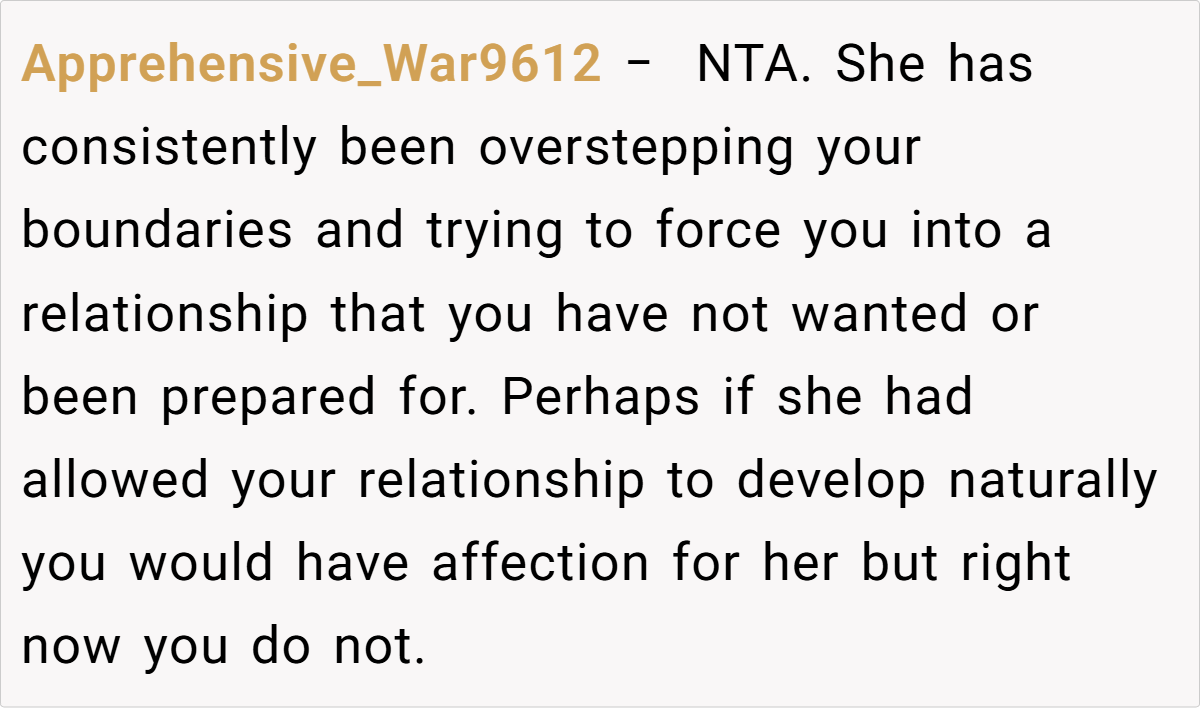 Most commenters expressed understanding and empathy for the teen’s need to set boundaries after losing his biological parent. They agreed that grief is personal and that forcing a close relationship with a stepparent can feel overwhelming. Many noted that while the stepmother may genuinely wish to form a bond, it’s important to let the teen heal at his own pace without pressure.