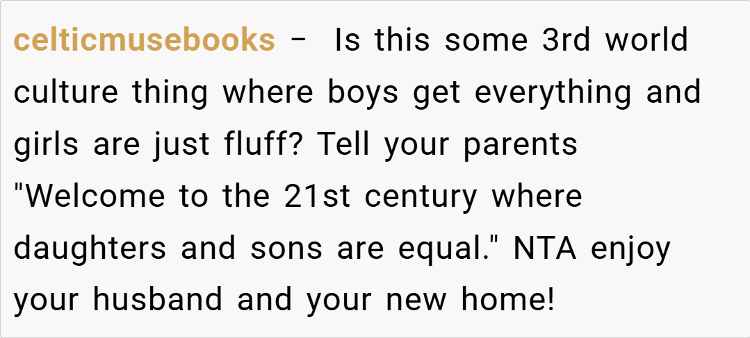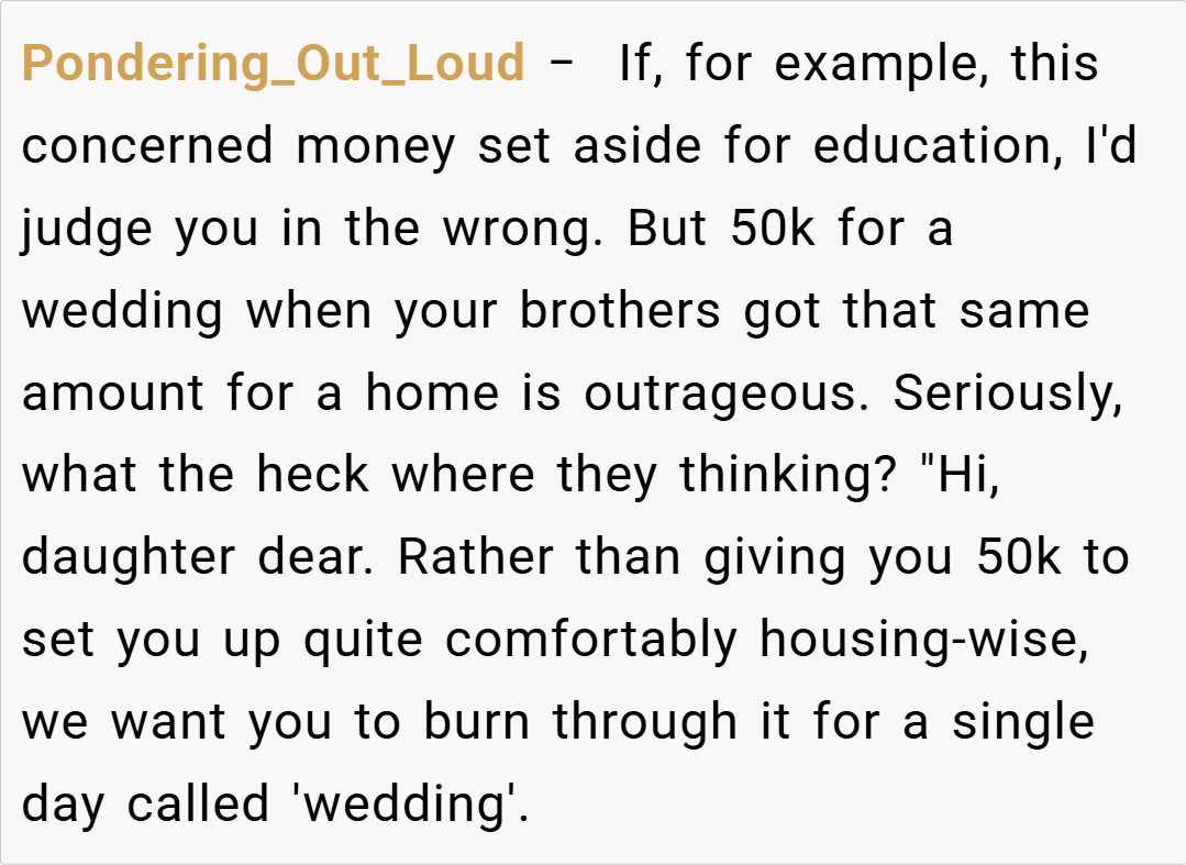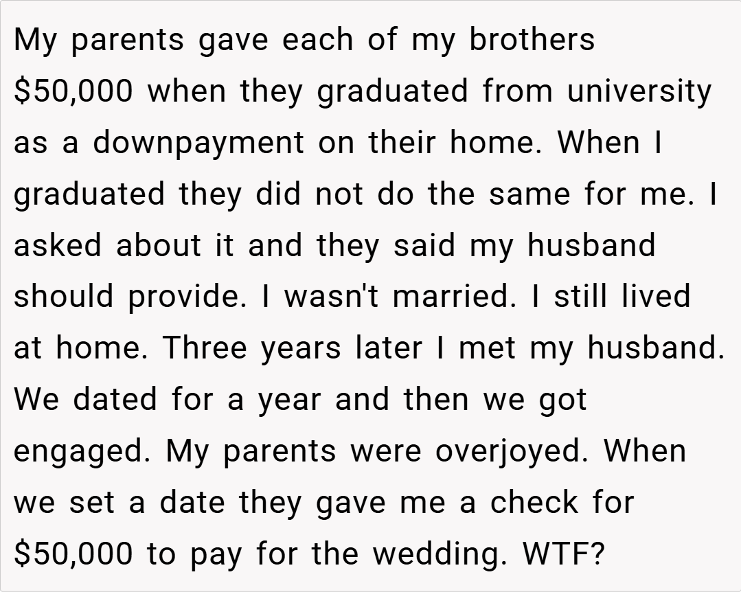 Family traditions and expectations can often become a battleground for differing visions of celebration and responsibility. In this story, our OP, a recently married woman, details how her parents gave her a generous $50,000 check meant for her wedding—money that her brothers received as a down payment for their first homes when they graduated. When OP inquired about the discrepancy, her parents insisted that since she wasn’t married yet and still lived at home,