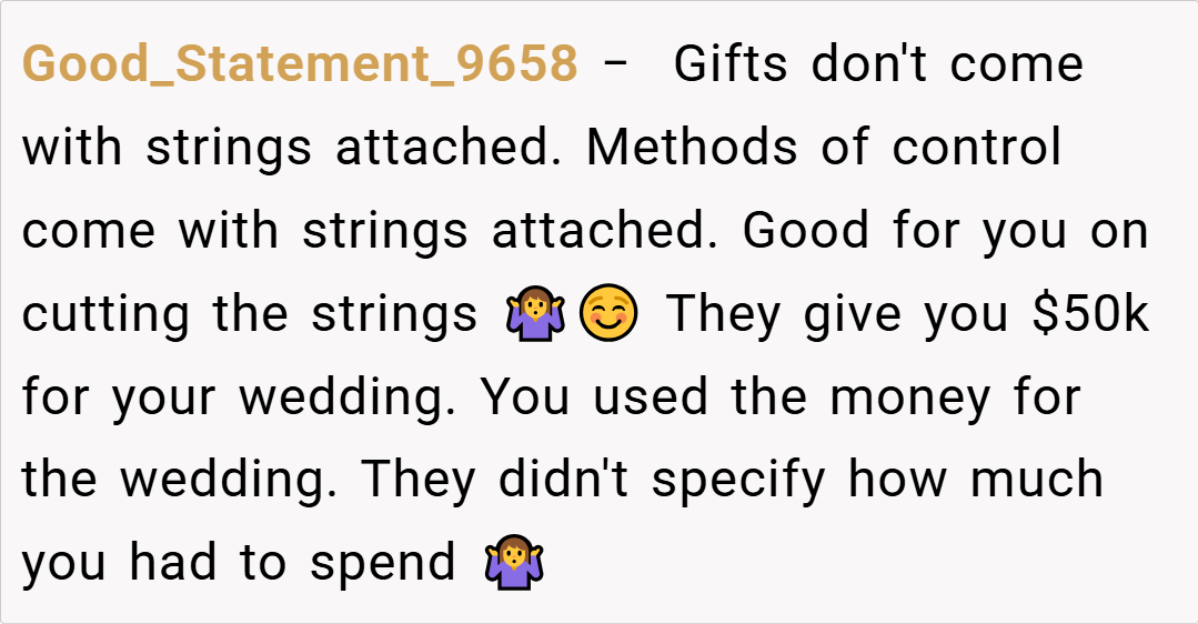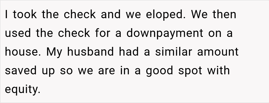 Ultimately, OP’s decision to accept the $50,000 check from her parents and then elope—using the funds as a down payment on a house—appears to be a choice made out of practicality and a focus on long-term stability. While her parents are understandably hurt by not having the traditional wedding they envisioned, OP argues that securing a home for her new family is more valuable than hosting a big party.