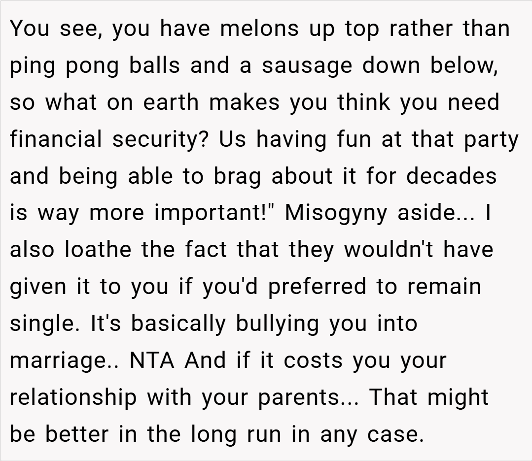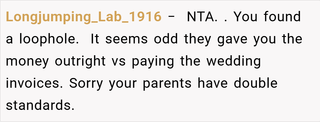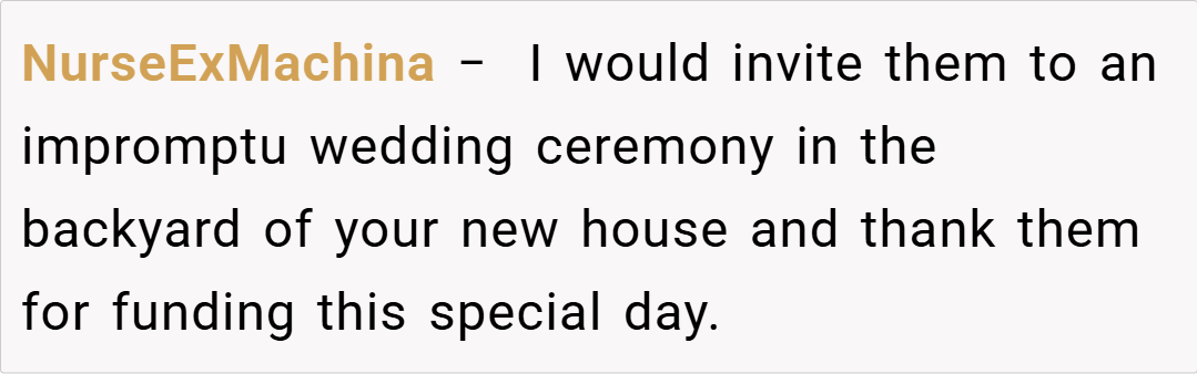 Many redditors empathize with OP’s choice, stating that financial stability—especially for a young couple starting their married life—is more important than throwing an extravagant wedding. “If you’re using the money to secure your home and future, you’re making a responsible choice,” one commenter noted.