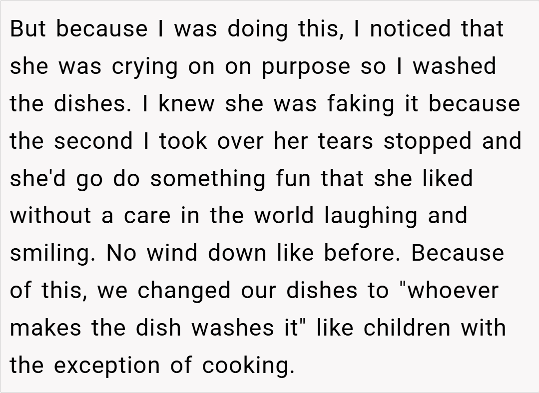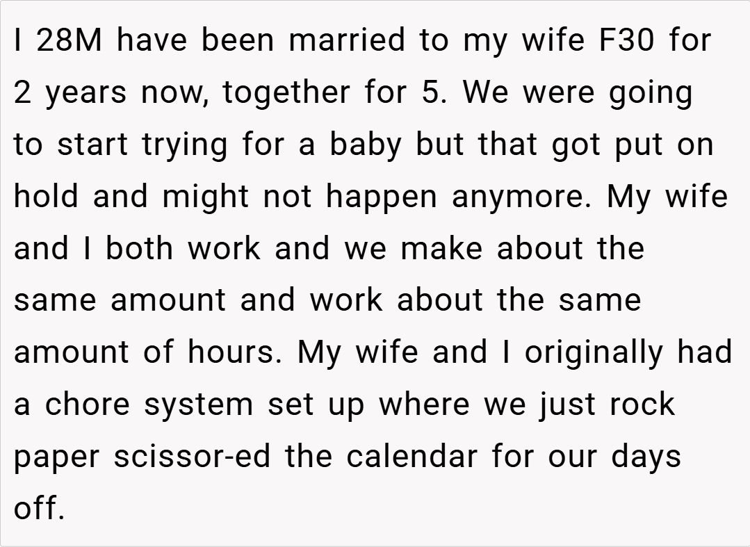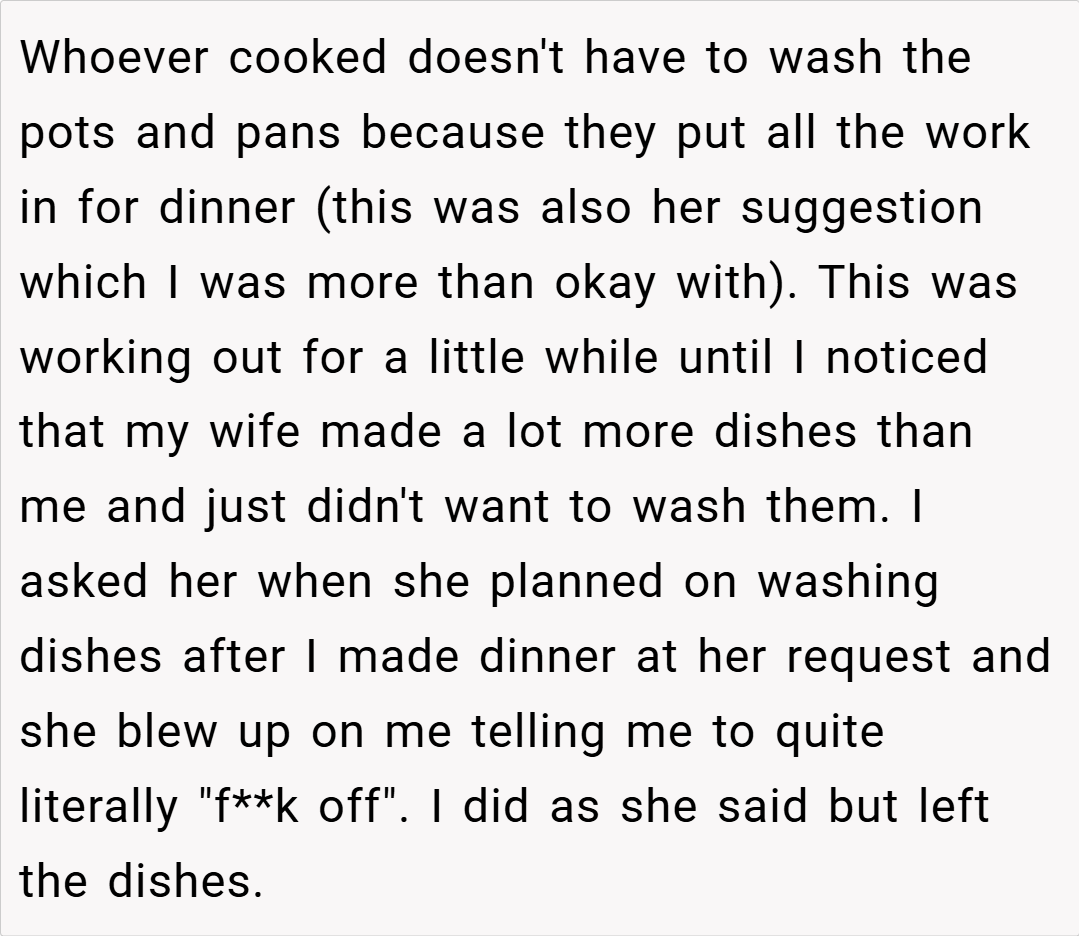 In every relationship, the buildup of everyday frustrations can sometimes boil over in unexpected and regrettable ways. Our OP, a 28‑year‑old man, recounts his exasperation with his wife—whom he’s been married to for two years (together for five)—over a seemingly mundane issue: dishwashing and laundry. What started as an agreed‑upon chore system eventually morphed into a daily source of tension.